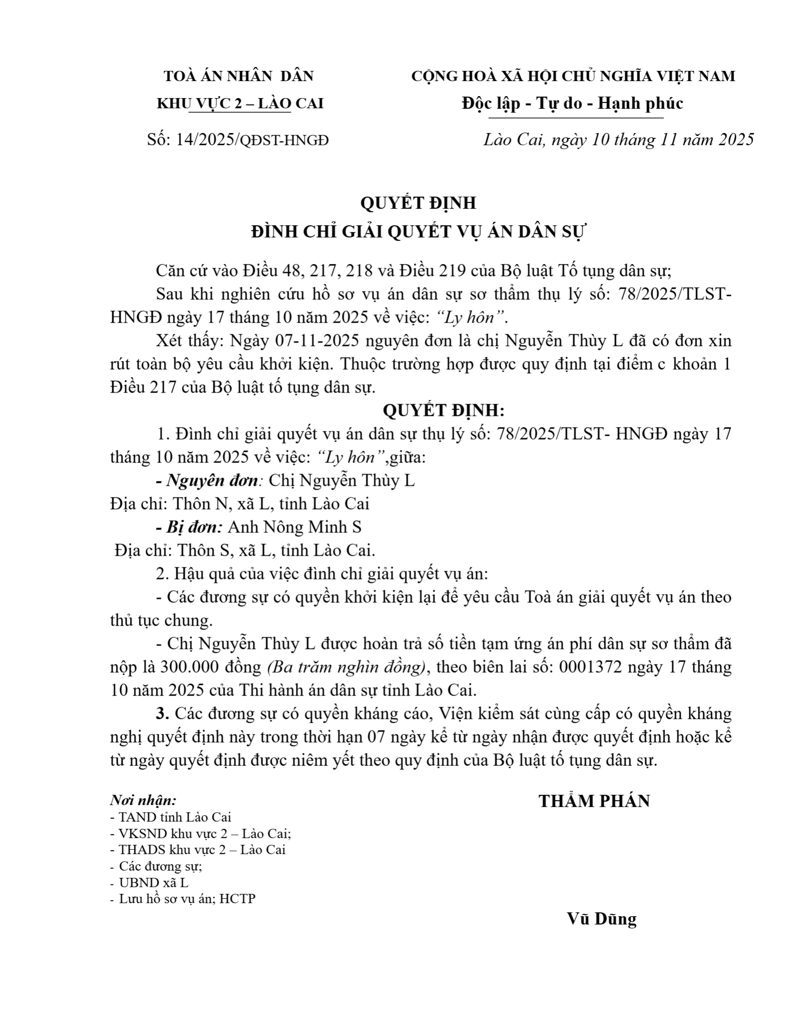 Quyết định số 14/2025/QĐST-HNGĐ ngày 10/11/2025 của Tòa án nhân dân khu vực 2 - Lào Cai, tỉnh Lào Cai về vụ án ly hôn về mâu thuẫn gia đình