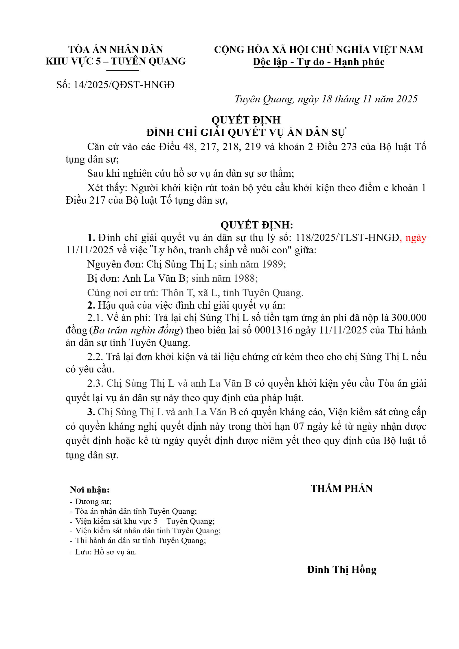 Quyết định số 14/2025/QĐST-HNGĐ ngày 18/11/2025 của Tòa án nhân dân khu vực 5 - Tuyên Quang, tỉnh Tuyên Quang về vụ án ly hôn về mâu thuẫn gia đình