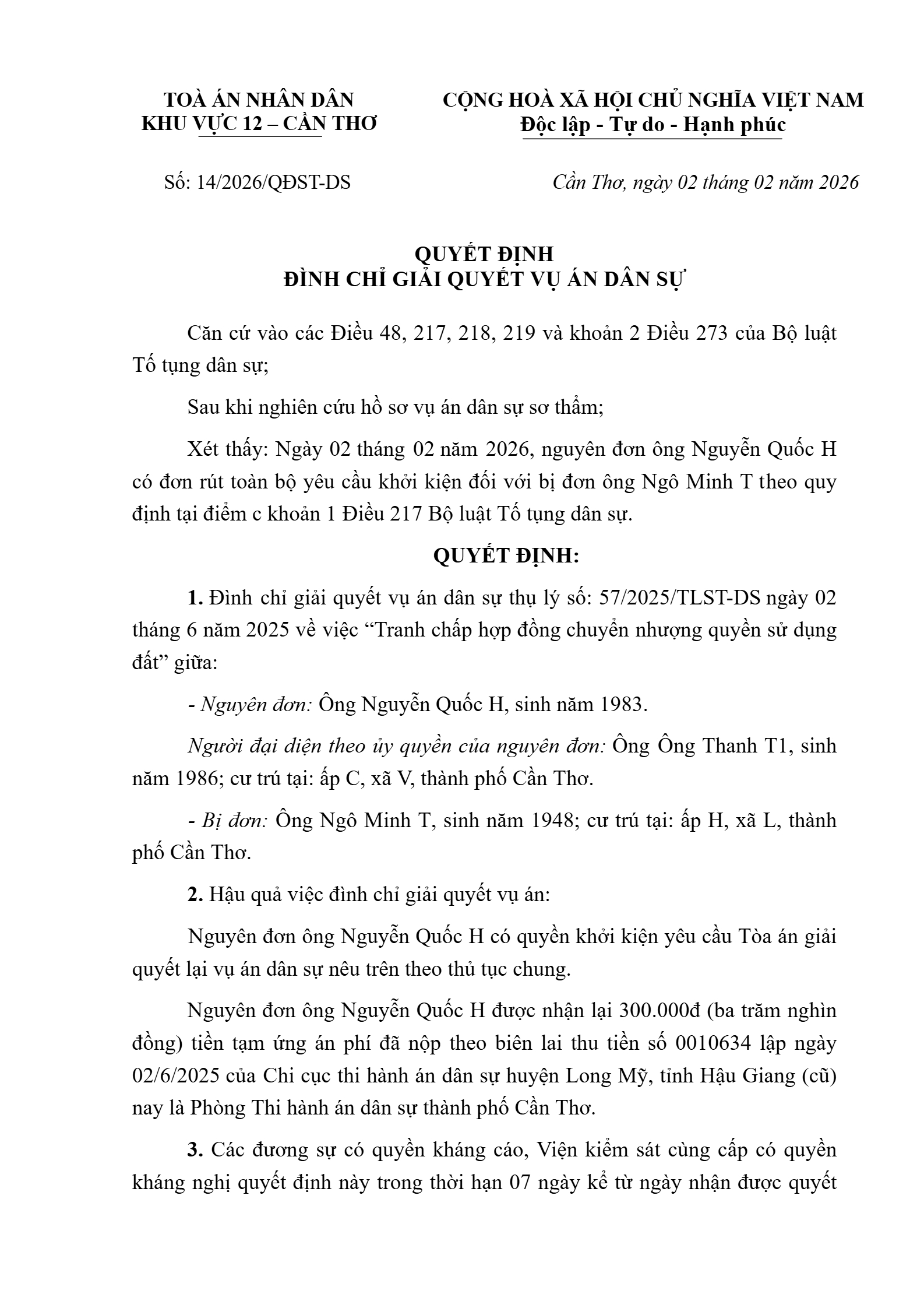 Quyết định số 14/2026/QĐST-DS ngày 02/02/2026 của Tòa án nhân dân khu vực 12 - Cần Thơ, TP. Cần Thơ về tranh chấp hợp đồng chuyển nhượng quyền sử dụng đất
