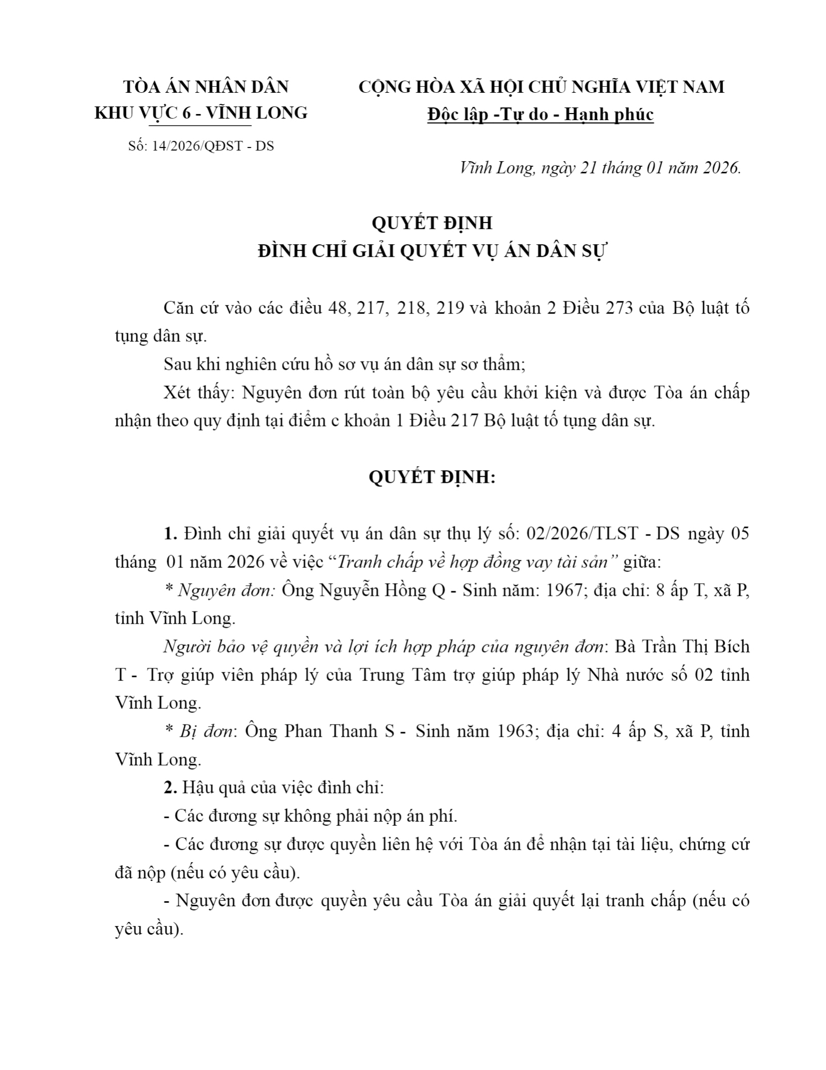 Quyết định số 14/2026/QĐST-DS ngày 21/01/2026 của Tòa án nhân dân khu vực 6 - Vĩnh Long, tỉnh Vĩnh Long về tranh chấp hợp đồng vay tài sản