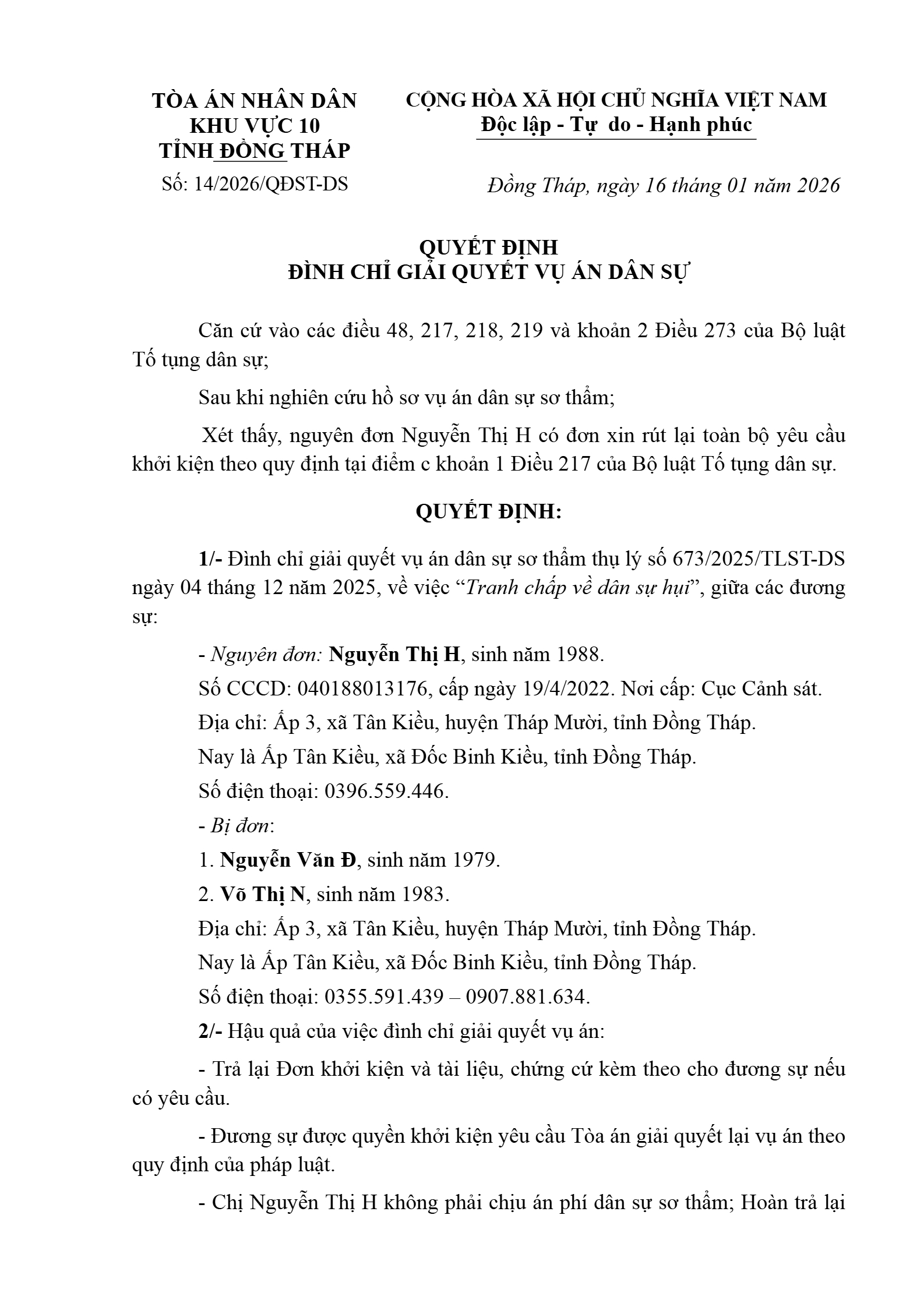 Quyết định số 14/2026/QĐST-DS ngày 16/01/2026 của Tòa án nhân dân khu vực 10 - Đồng Tháp, tỉnh Đồng Tháp về tranh chấp về hụi, họ, biêu, phường