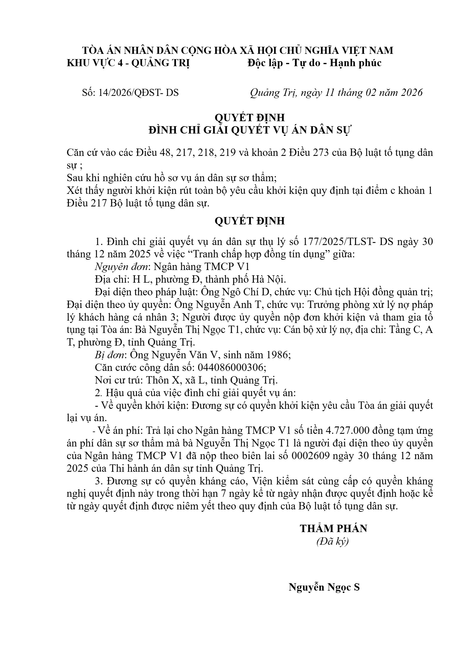 Quyết định số 14/2026/QĐST-DS ngày 11/02/2026 của Tòa án nhân dân khu vực 4 - Quảng Trị, tỉnh Quảng Trị về tranh chấp hợp đồng tín dụng
