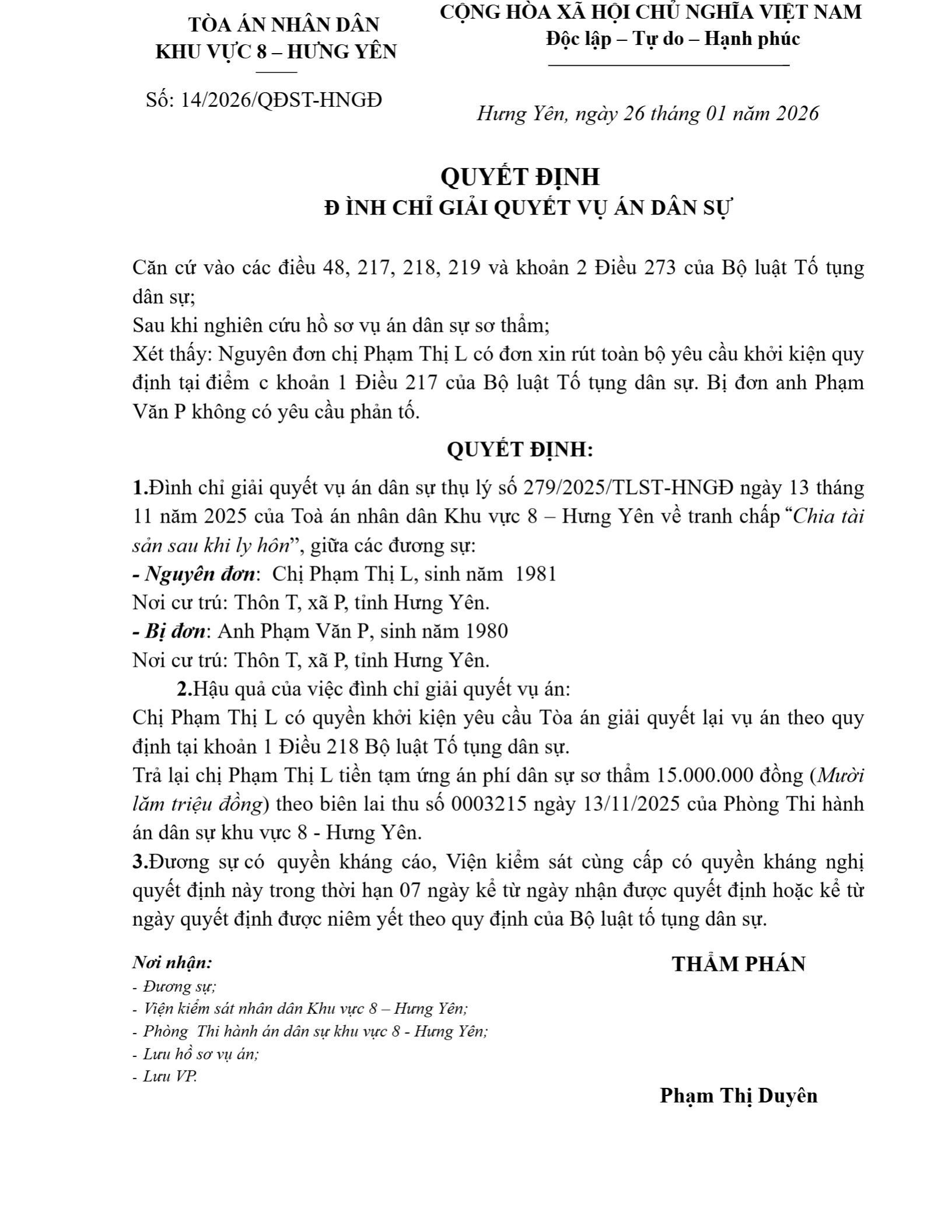 | Thông tin về vụ/việc: | Quyết định đình chỉ giải quyết vụ án dân sự giữa chị Phạm Thị L và anh Phạm Văn P |