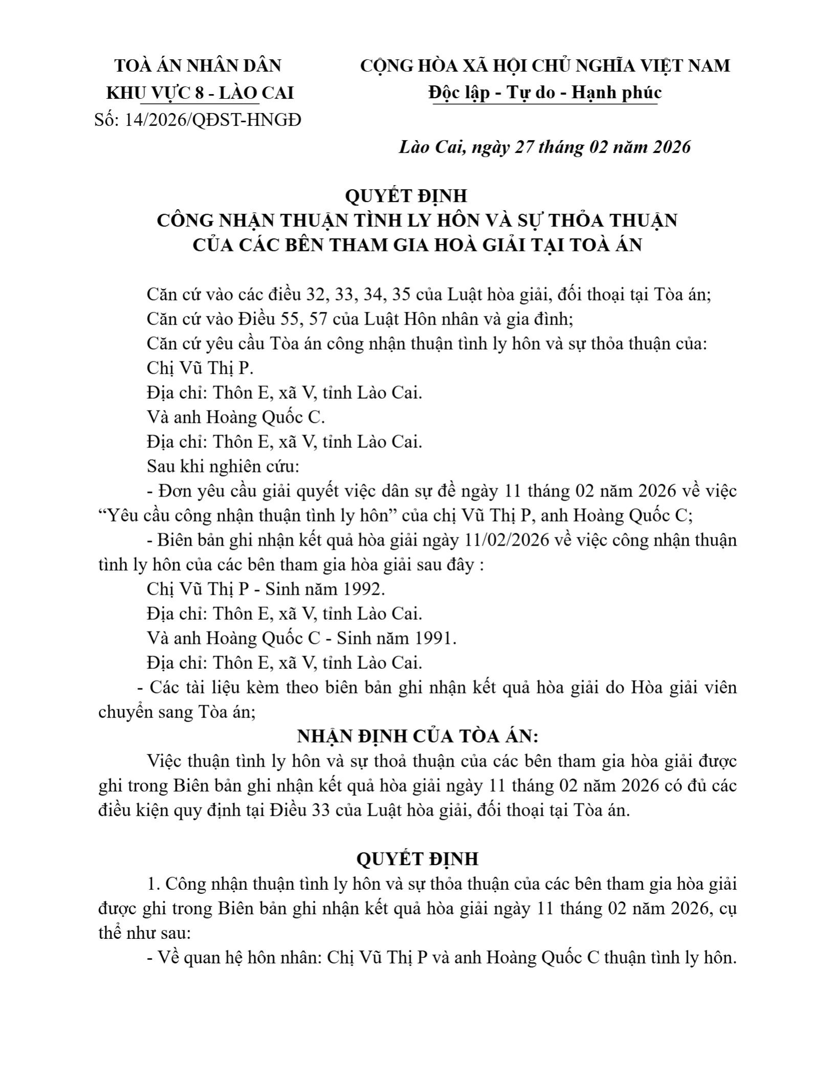 Quyết định số 14/2026/QĐST-HNGĐ ngày 27/02/2026 của Tòa án nhân dân khu vực 8 - Lào Cai, tỉnh Lào Cai về vụ án ly hôn về mâu thuẫn gia đình