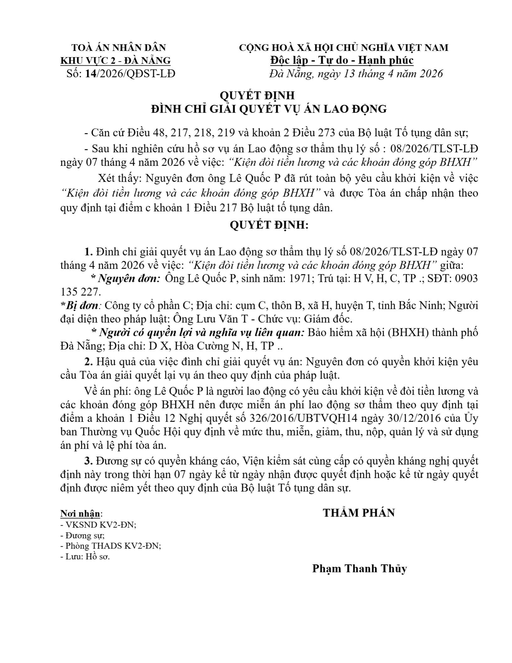 Quyết định số 14/2026/QĐST-LĐ ngày 13/04/2026 của Tòa án nhân dân khu vực 2 - Đà Nẵng, TP Đà Nẵng về tranh chấp về bảo hiểm xã hội, bảo hiểm y tế, bảo hiểm thất nghiệp, bảo hiểm tai nạn lao động, bệnh nghề nghiệp