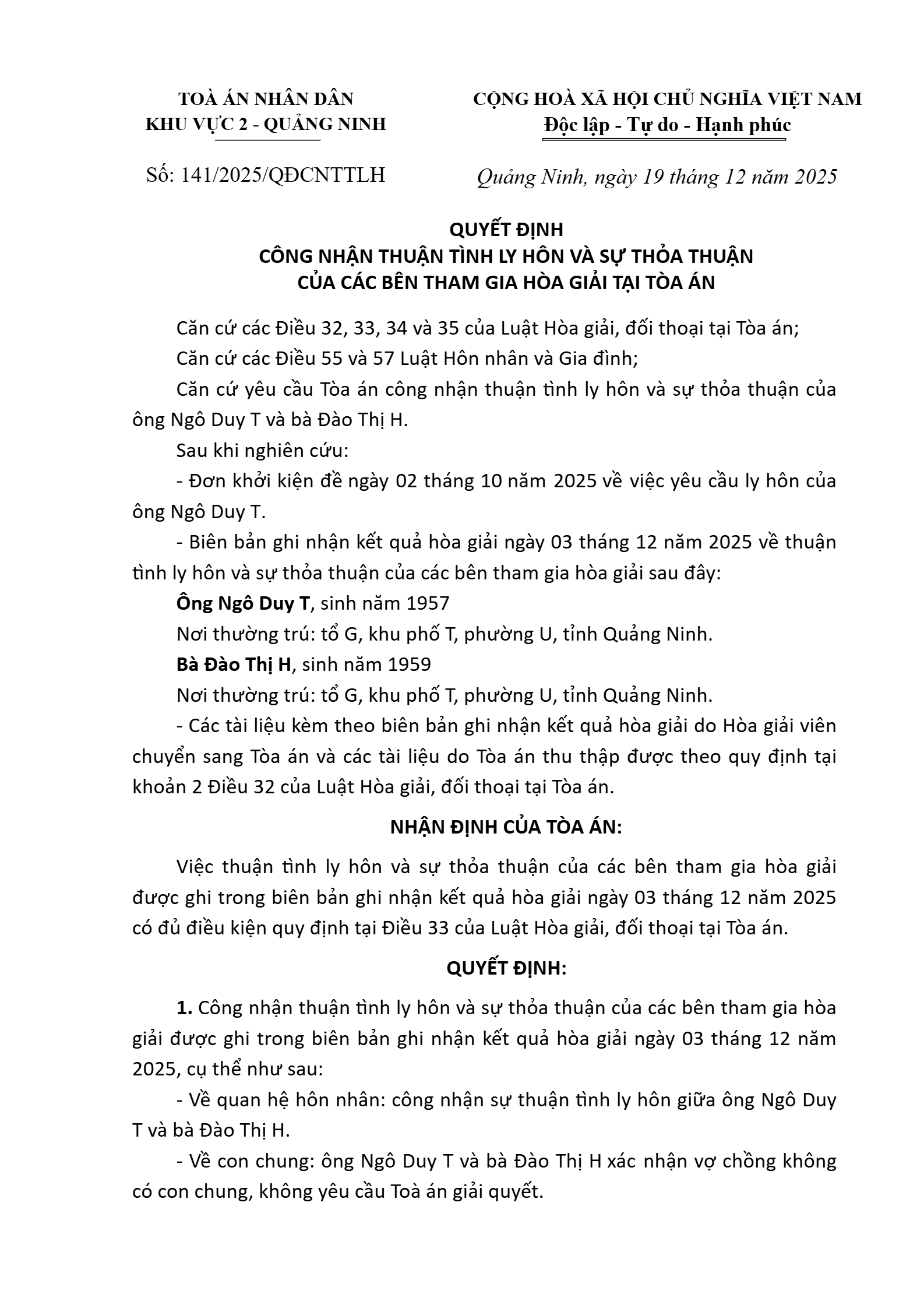 Quyết định số 141/2025/QĐST-HNGĐ ngày 19/12/2025 của Tòa án nhân dân khu vực 2 - Quảng Ninh, tỉnh Quảng Ninh về vụ án ly hôn về mâu thuẫn gia đình