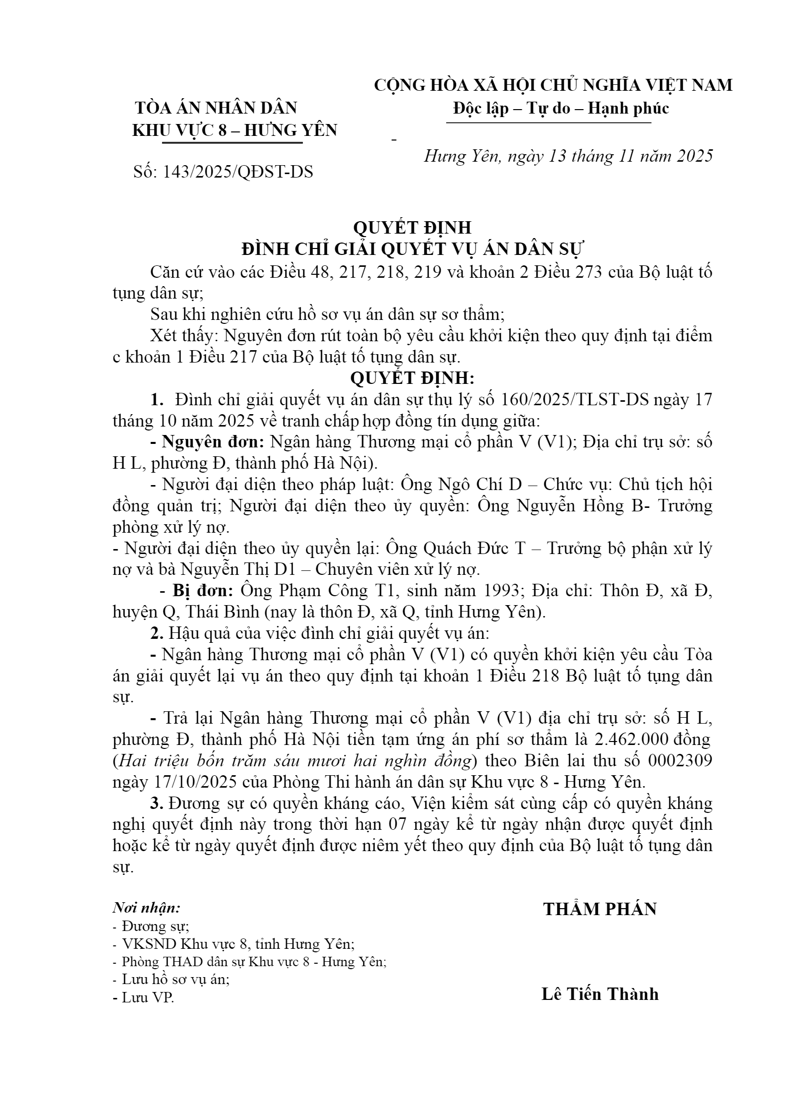 Quyết định số 143/2025/QĐST-DS ngày 20/11/2025 của Tòa án nhân dân khu vực 8 - Hưng Yên, tỉnh Hưng Yên về tranh chấp hợp đồng tín dụng