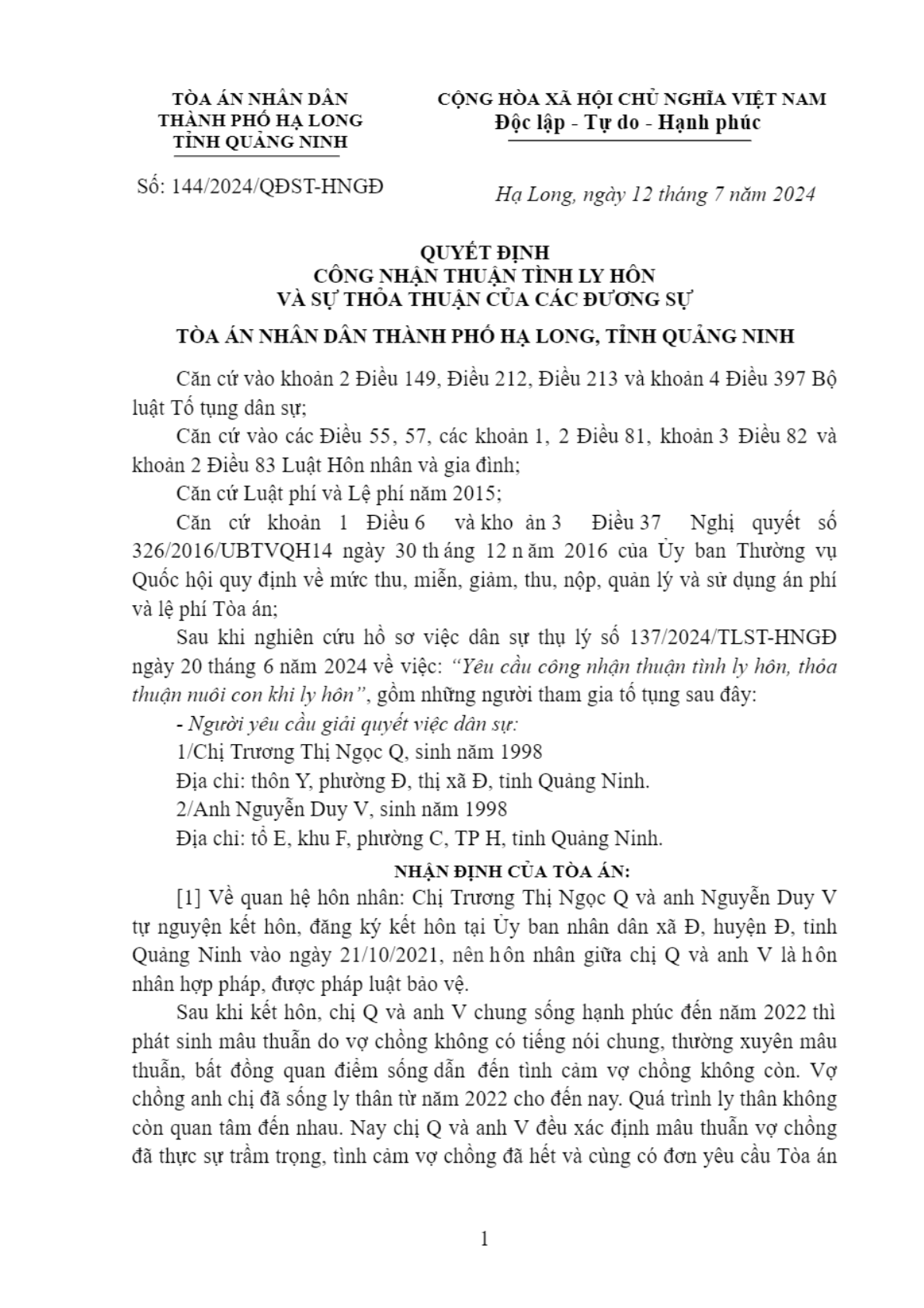 Quyết định số 144/2024/QĐST-HNGĐ ngày 12/07/2024 của TAND TP. Hạ Long, tỉnh Quảng Ninh về yêu cầu công nhận thuận tình ly hôn