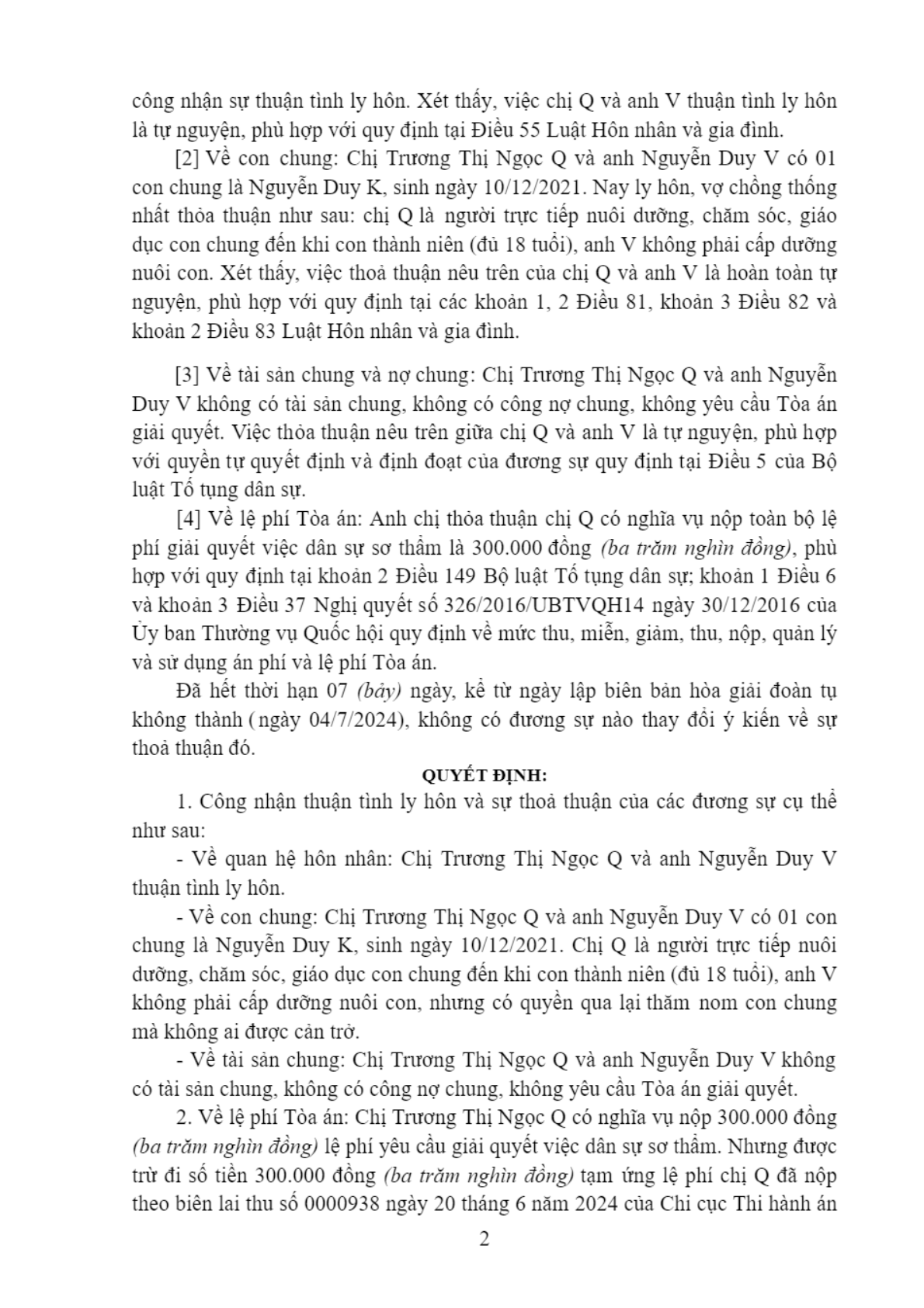 | Thông tin về vụ/việc: | “Yêu cầu công nhận thuận tình ly hôn, thỏa thuận nuôi con khi ly hôn”, giữa |