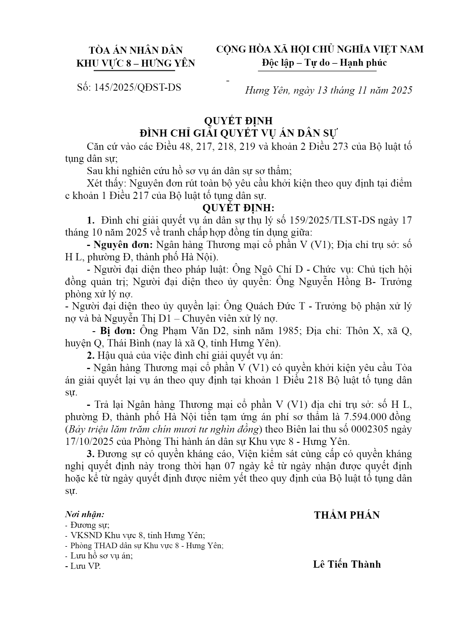 Quyết định số 145/2025/QĐST-DS ngày 13/11/2025 của Tòa án nhân dân khu vực 8 - Hưng Yên, tỉnh Hưng Yên về tranh chấp hợp đồng tín dụng