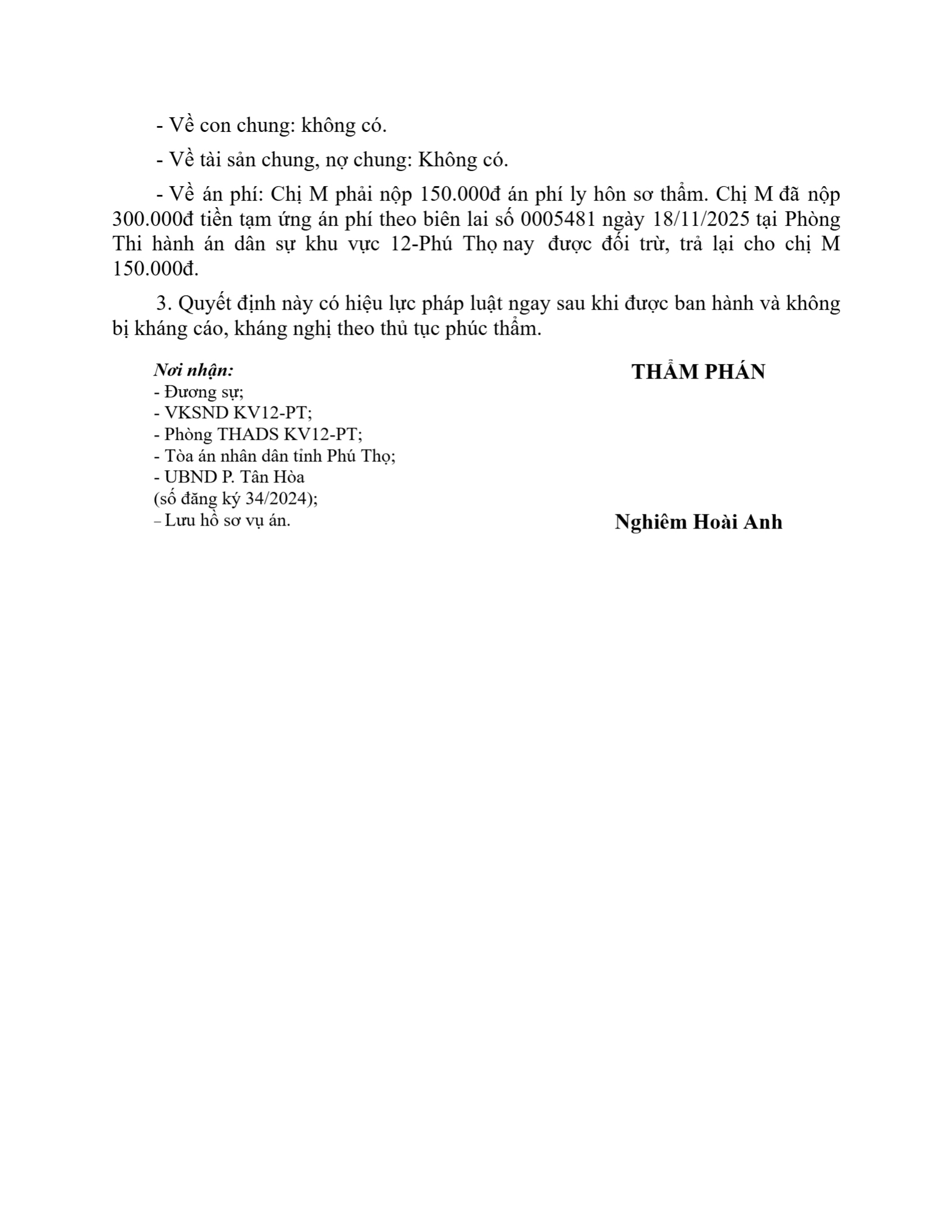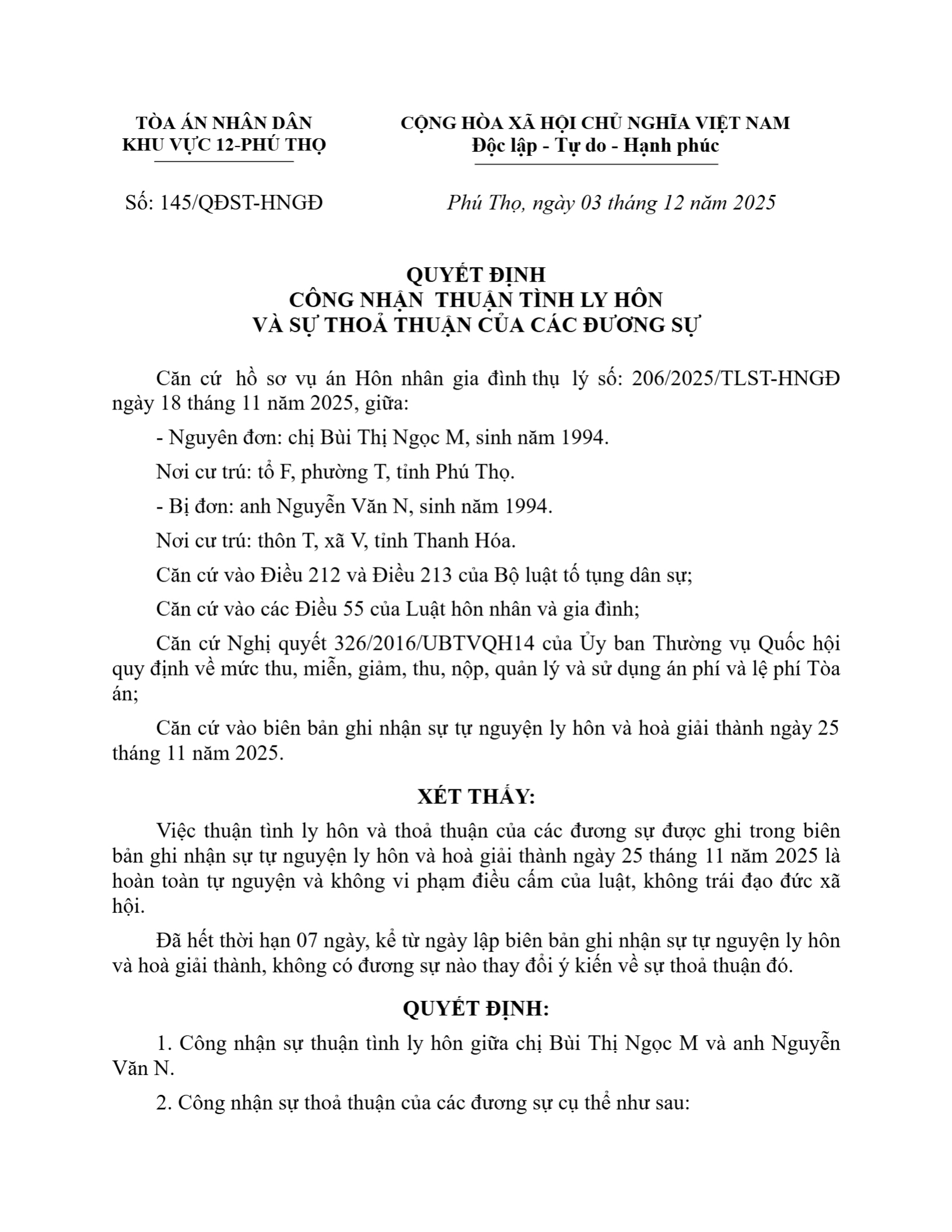 Quyết định số 145/2025/QĐST-HNGĐ ngày 03/12/2025 của Tòa án nhân dân khu vực 12 - Phú Thọ, tỉnh Phú Thọ về vụ án ly hôn về mâu thuẫn gia đình
