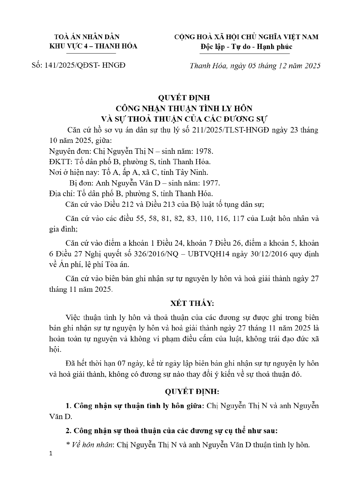 | Thông tin về vụ/việc: | Công nhận thuận tình ly hôn, giao mỗi người nuôi 01 con |