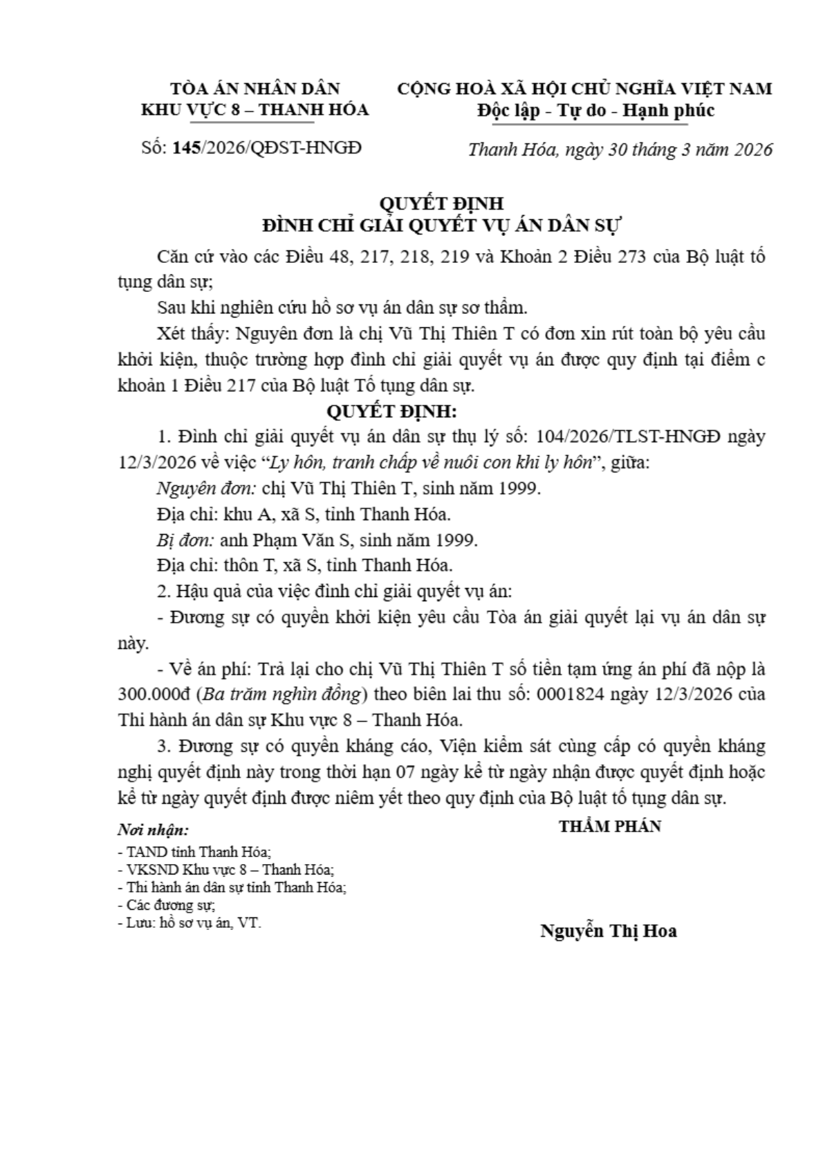 Quyết định số 145/2026/QĐST-HNGĐ ngày 30/03/2026 của Tòa án nhân dân khu vực 8 - Thanh Hóa, tỉnh Thanh Hóa về vụ án ly hôn về mâu thuẫn gia đình