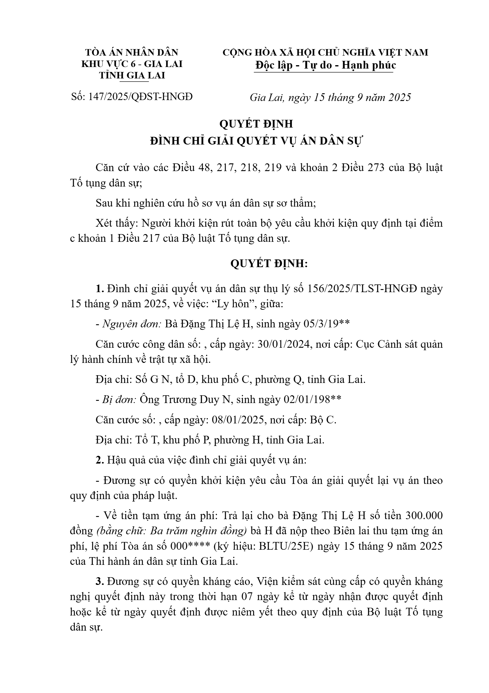 Quyết định số 147/2025/QĐST-HNGĐ ngày 15/09/2025 của Tòa án nhân dân khu vực 6 - Gia Lai, tỉnh Gia Lai về vụ án ly hôn về mâu thuẫn gia đình