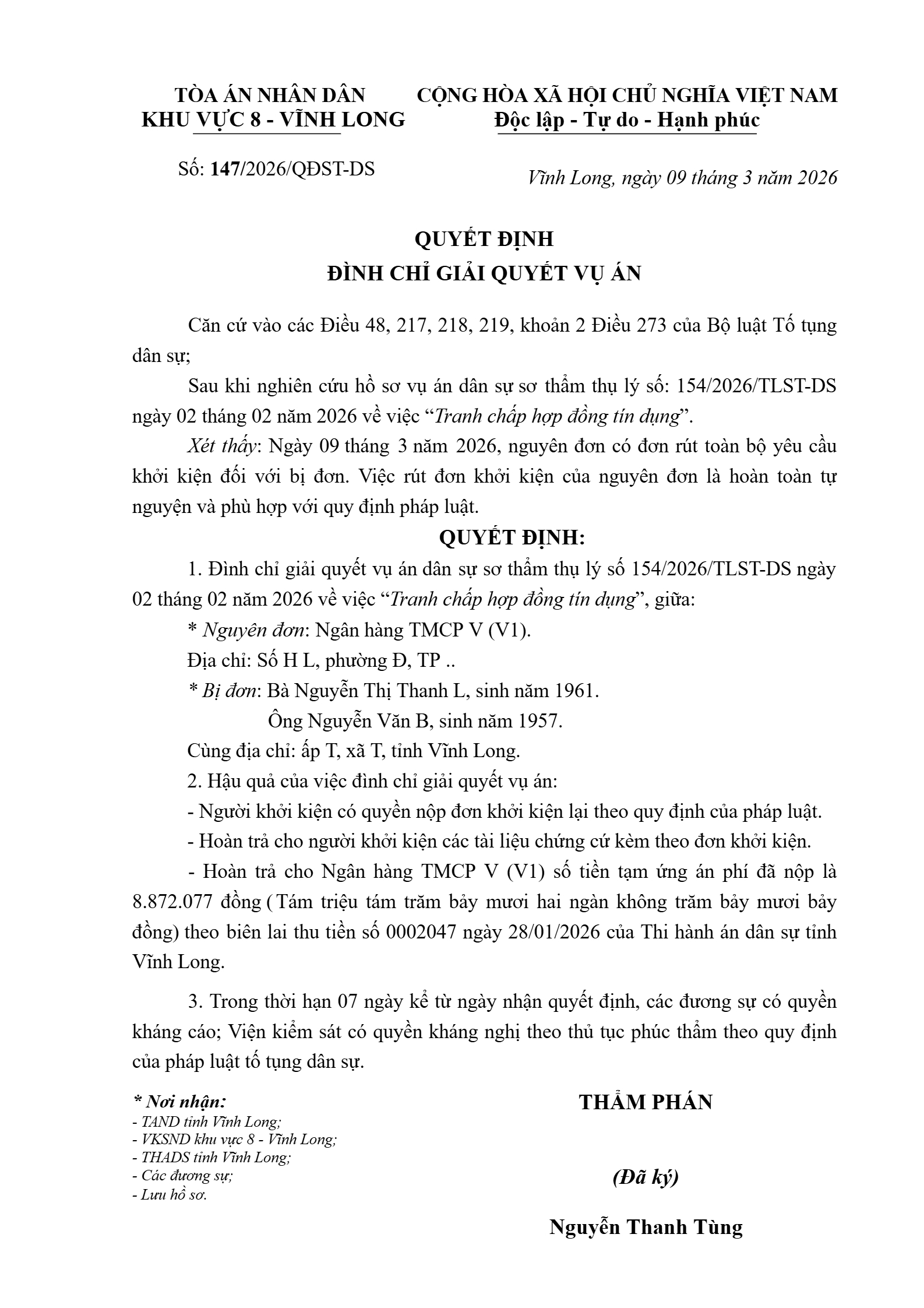 Quyết định số 147/2026/QĐST-DS ngày 09/03/2026 của Tòa án nhân dân khu vực 8 - Vĩnh Long, tỉnh Vĩnh Long về tranh chấp hợp đồng tín dụng