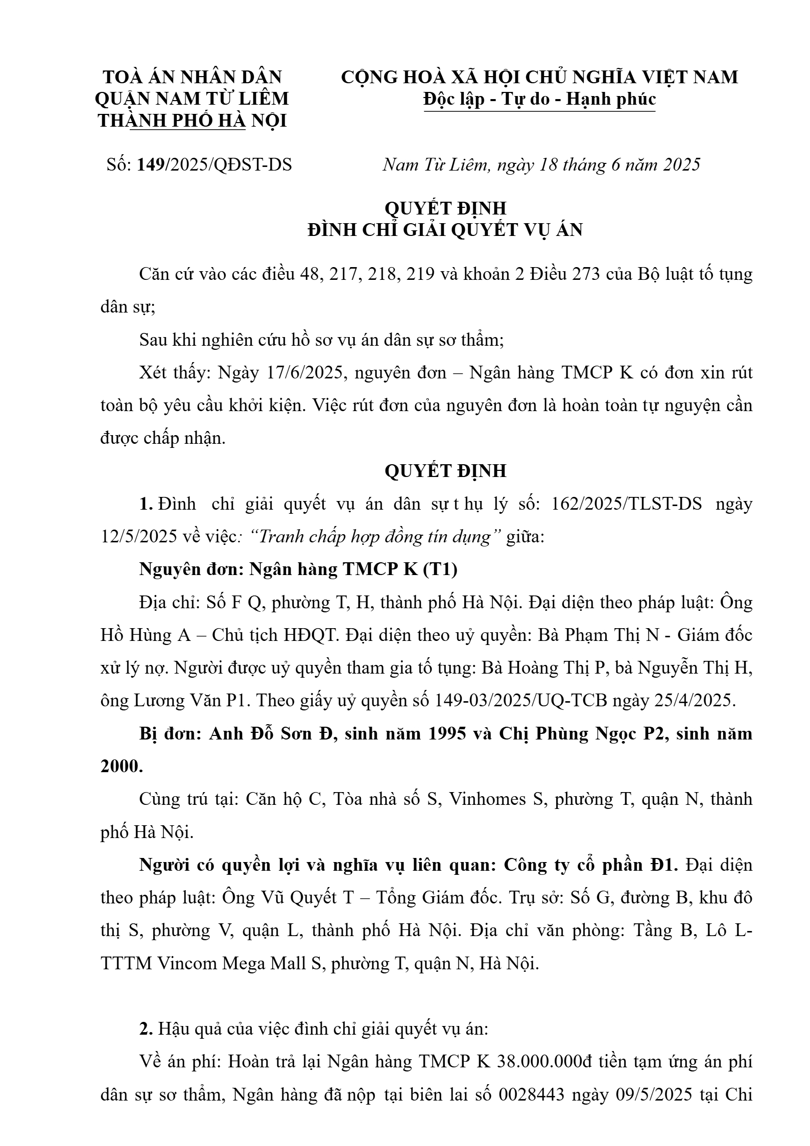 Quyết định số 149/2025/QĐST-DS ngày 18/06/2025 của TAND Q. Nam Từ Liêm, TP. Hà Nội về tranh chấp hợp đồng tín dụng