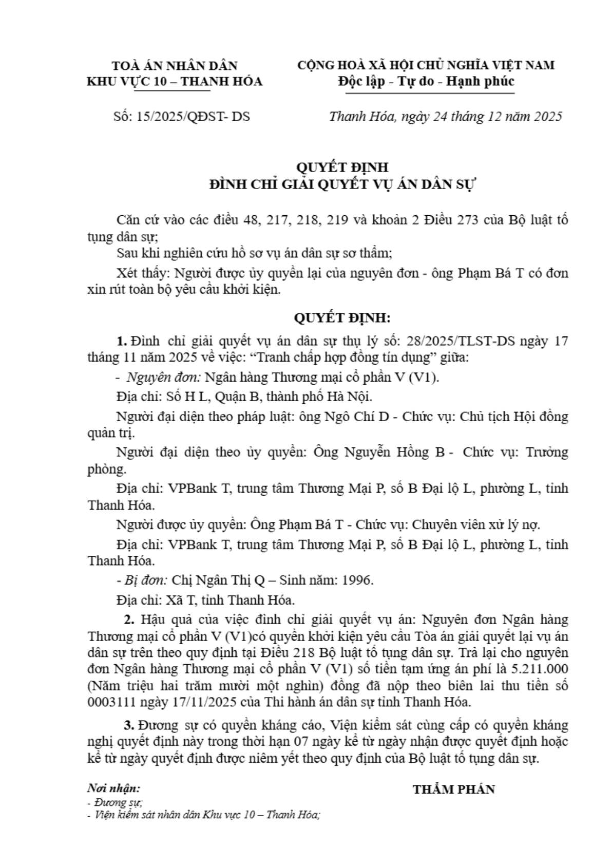 Quyết định số 15/2025/QĐST-DS ngày 24/12/2025 của Tòa án nhân dân khu vực 10 - Thanh Hóa, tỉnh Thanh Hóa về tranh chấp hợp đồng tín dụng