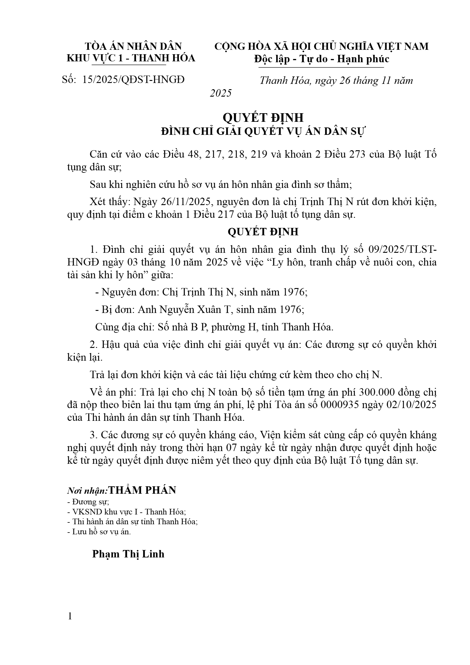 Quyết định số 15/2025/QĐST-HNGĐ ngày 26/11/2025 của Tòa án nhân dân khu vực 1 - Thanh Hóa, tỉnh Thanh Hóa về vụ án ly hôn về mâu thuẫn gia đình