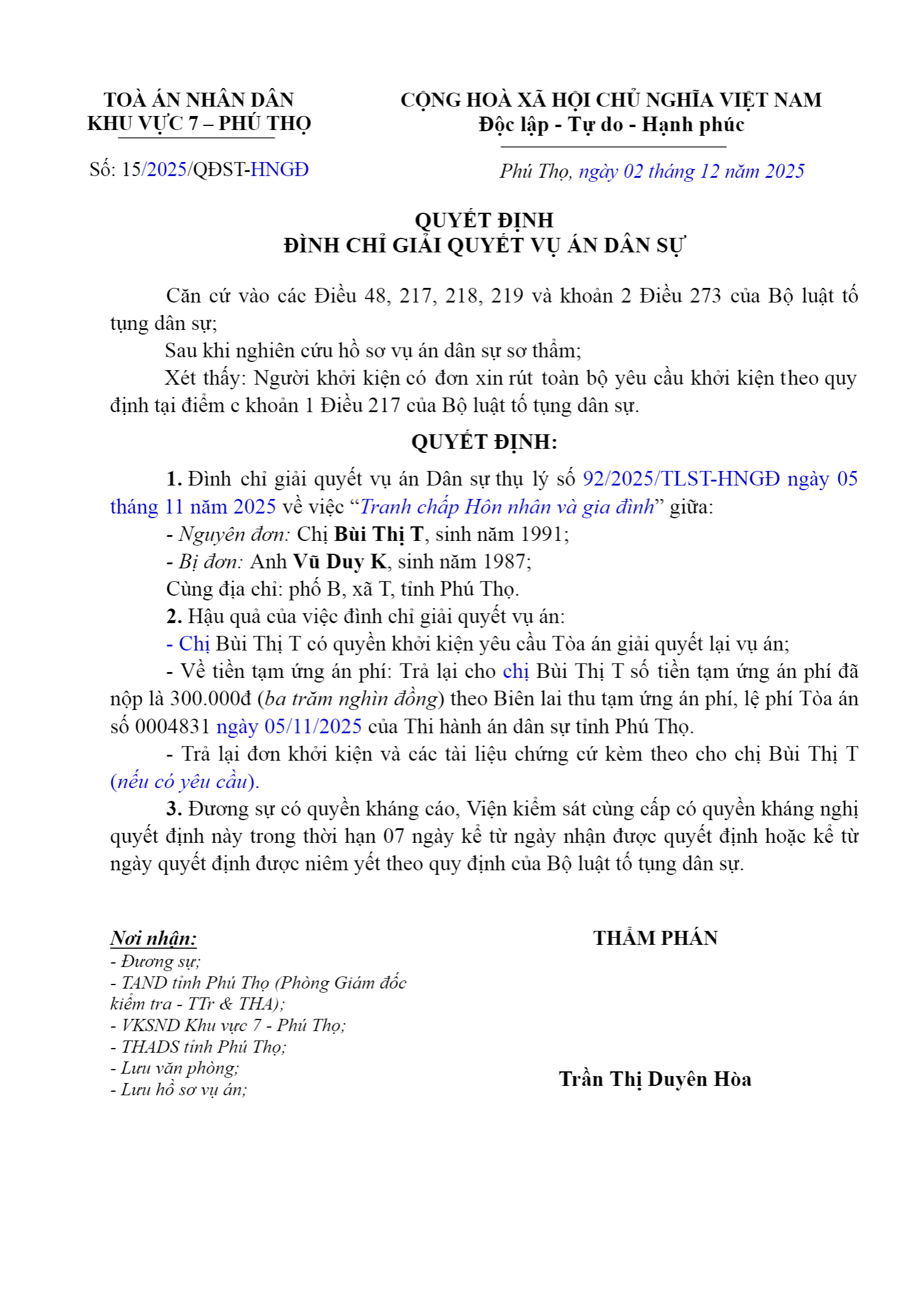Quyết định số 15/2025/QĐST-HNGĐ ngày 02/12/2025 của Tòa án nhân dân khu vực 7 - Phú Thọ, tỉnh Phú Thọ về vụ án ly hôn về mâu thuẫn gia đình