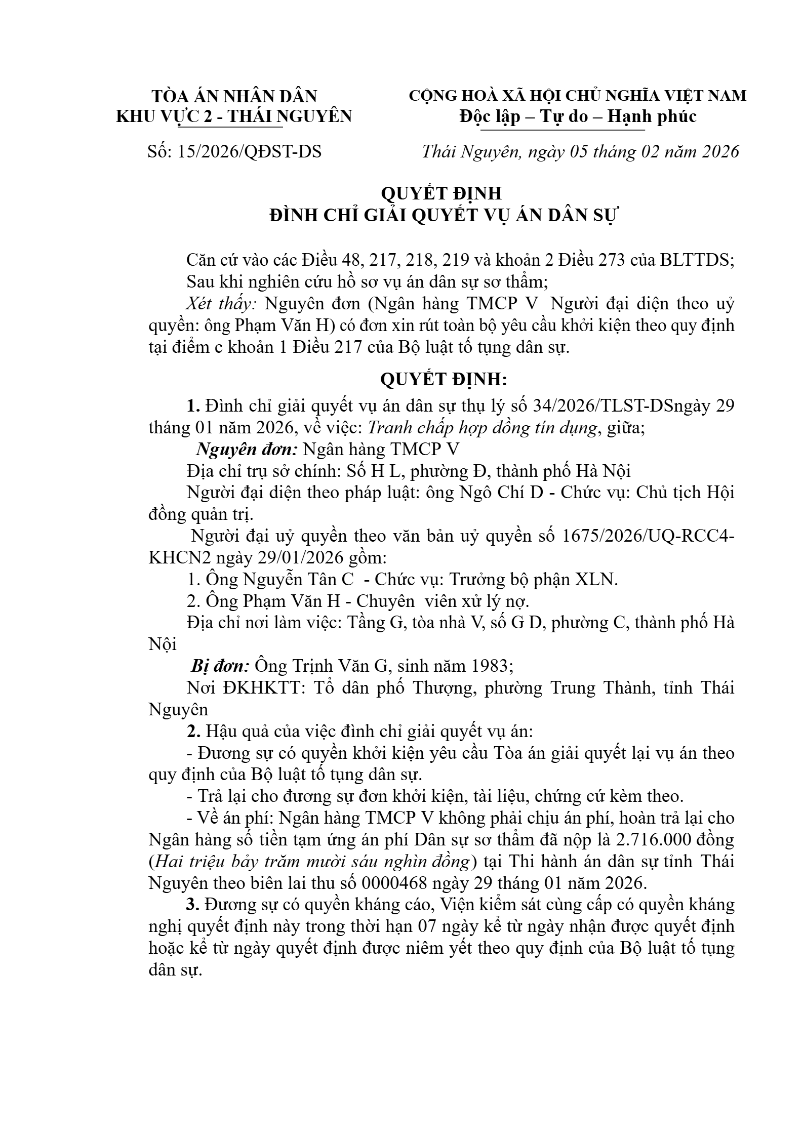 Quyết định số 15/2026/QĐST-DS ngày 05/02/2026 của Tòa án nhân dân khu vực 2 - Thái Nguyên, tỉnh Thái Nguyên về tranh chấp hợp đồng tín dụng