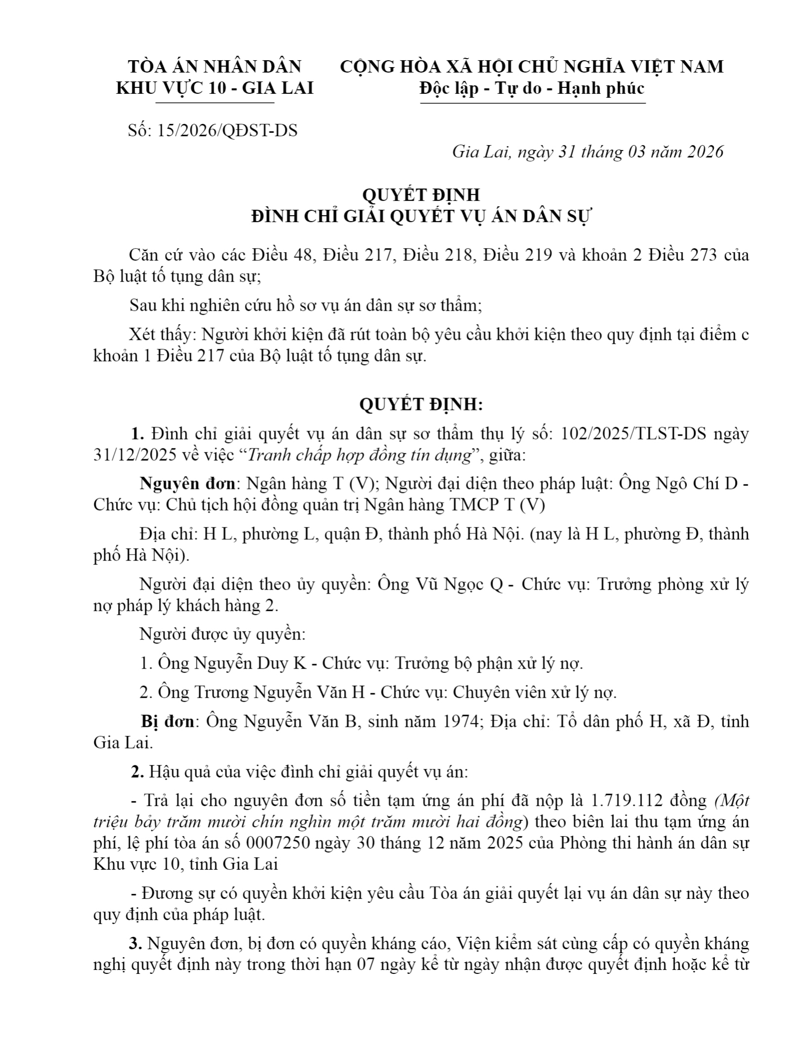 Quyết định số 15/2026/QĐST-DS ngày 31/03/2026 của Tòa án nhân dân khu vực 10 - Gia Lai, tỉnh Gia Lai về tranh chấp hợp đồng tín dụng