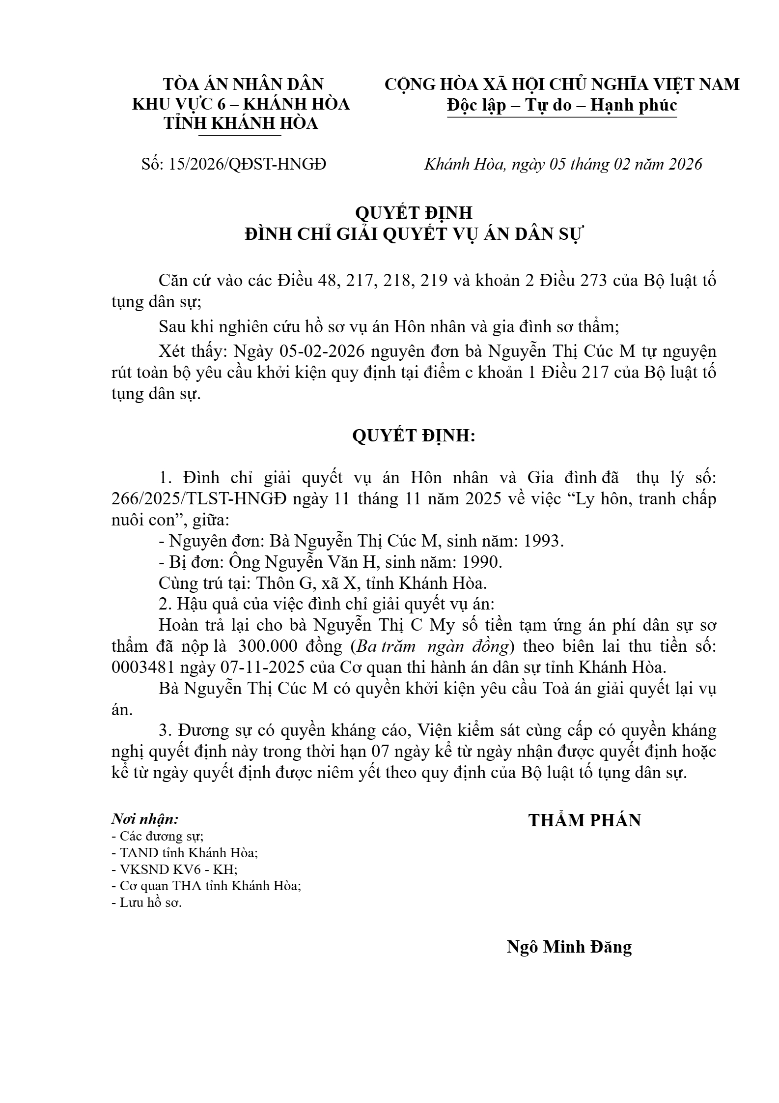 Quyết định số 15/2026/QĐST-HNGĐ ngày 05/02/2026 của Tòa án nhân dân khu vực 6 - Khánh Hòa, tỉnh Khánh Hòa về vụ án ly hôn về mâu thuẫn gia đình