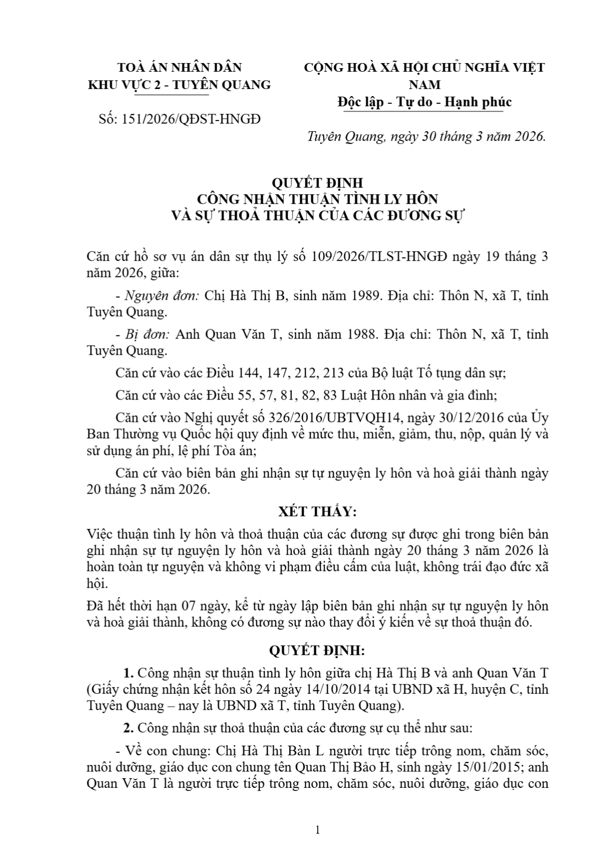 Quyết định số 151/2026/QĐST-HNGĐ ngày 30/03/2026 của Tòa án nhân dân khu vực 2 - Tuyên Quang, tỉnh Tuyên Quang về vụ án ly hôn về mâu thuẫn gia đình