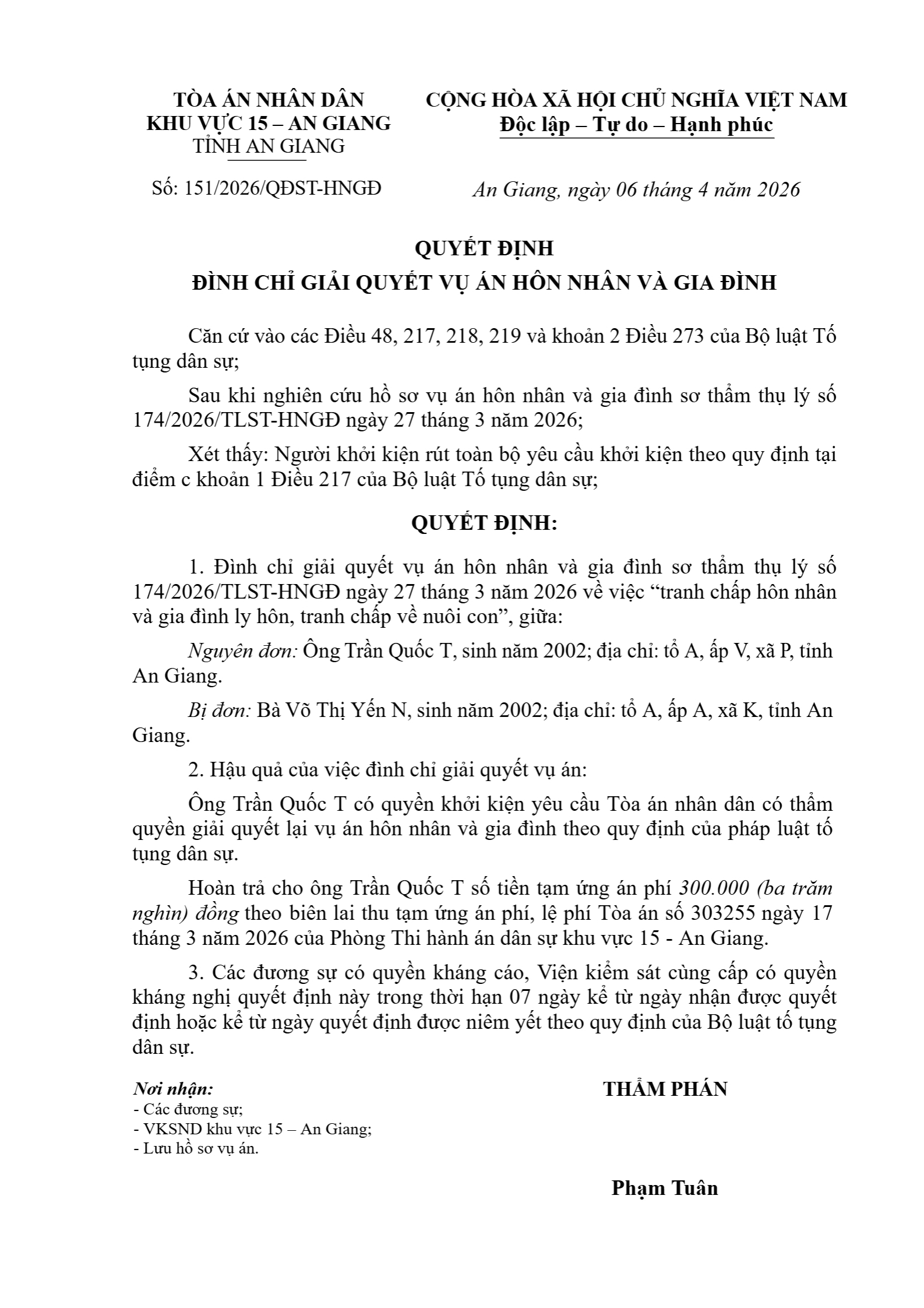 | Thông tin về vụ/việc: | Ông Trần Quốc T có quyền khởi kiện yêu cầu Tòa án nhân dân có thẩm quyền giải quyết lại vụ án hôn nhân và gia đình theo quy định của pháp luật tố tụng dân sự.Hoàn trả cho ông Trần Quốc T số tiền tạm ứng án phí 300.000 (ba trăm nghìn) đồng theo biên lai thu tạm ứng án phí, lệ phí Tòa án số 303255 ngày 17 tháng 3 năm 2026 của Phòng Thi hành án dân sự khu vực 15 - An Giang |