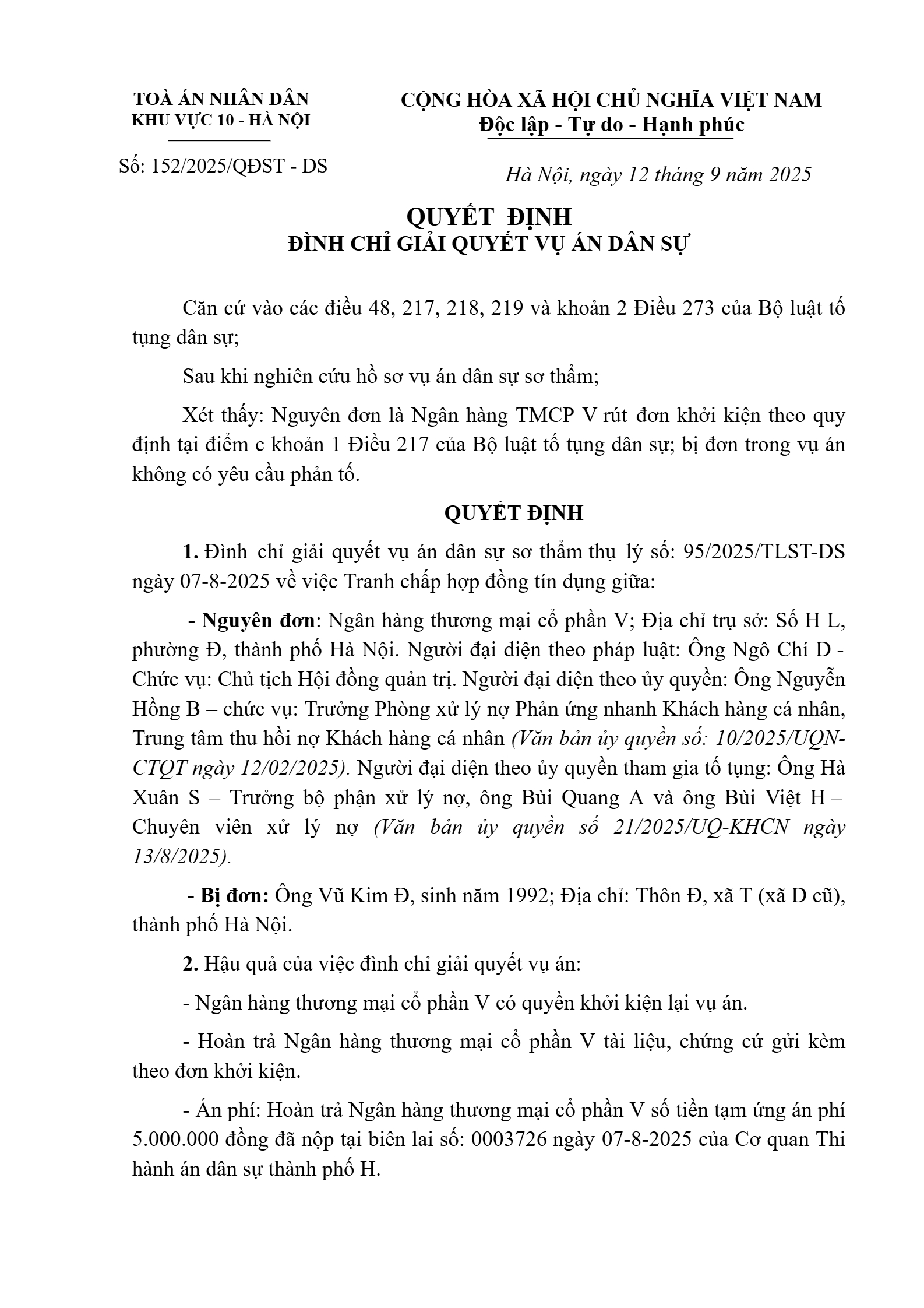 Quyết định số 152/2025/QĐST-DS ngày 12/09/2025 của Tòa án nhân dân khu vực 10 - Hà Nội, TP. Hà Nội về tranh chấp hợp đồng tín dụng