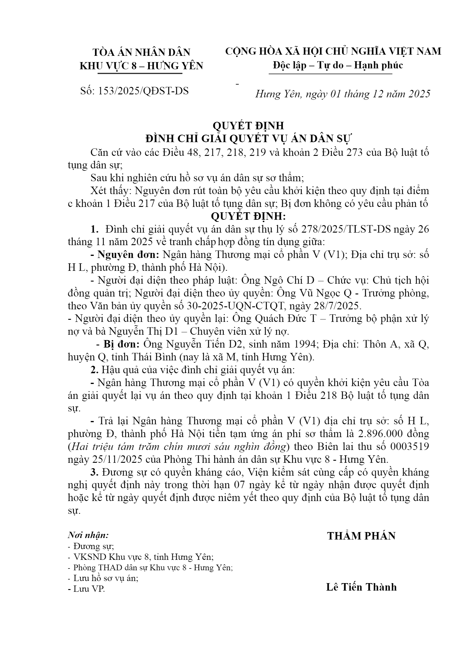 Quyết định số 153/2025/QĐST-DS ngày 01/12/2025 của Tòa án nhân dân khu vực 8 - Hưng Yên, tỉnh Hưng Yên về tranh chấp hợp đồng tín dụng