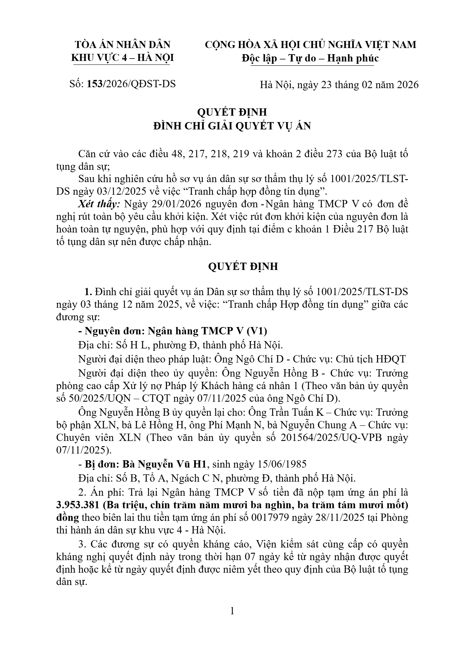 | Tên Quyết định: | Quyết định số 153/2026/QĐST-DS ngày 23/02/2026 của Tòa án nhân dân khu vực 4 - Hà Nội, TP. Hà Nội về tranh chấp hợp đồng tín dụng |