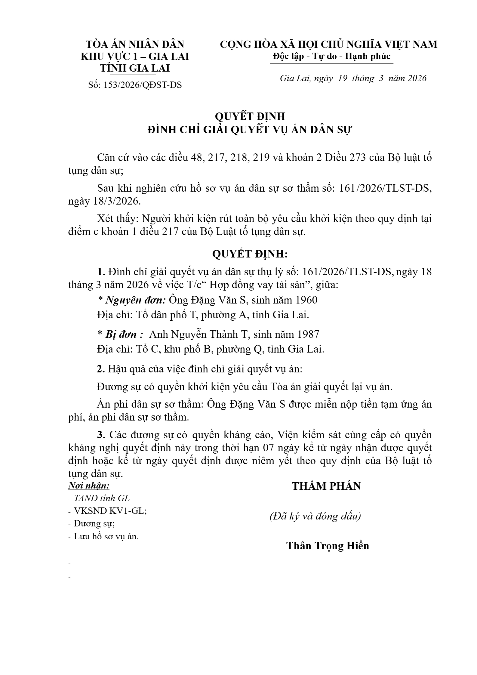 Quyết định số 153/2026/QĐST-DS ngày 19/03/2026 của Tòa án nhân dân khu vực 1 - Gia Lai, tỉnh Gia Lai về tranh chấp hợp đồng vay tài sản