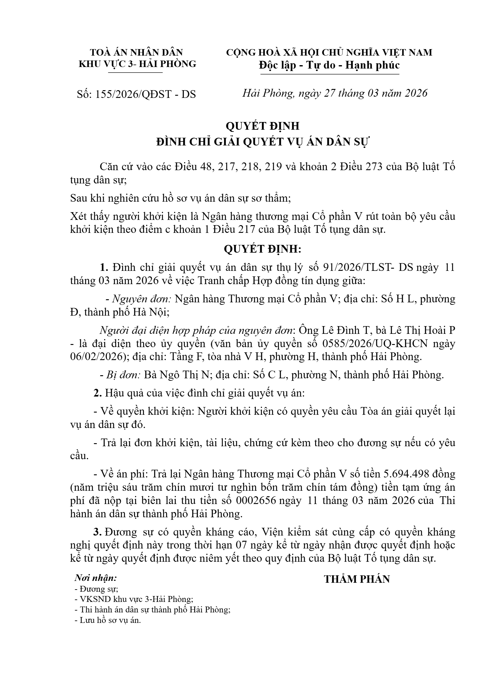 | Tên Quyết định: | Quyết định số 155/2026/QĐST-DS ngày 27/03/2026 của Tòa án nhân dân khu vực 3 - Hải Phòng, TP. Hải Phòng về tranh chấp hợp đồng tín dụng |