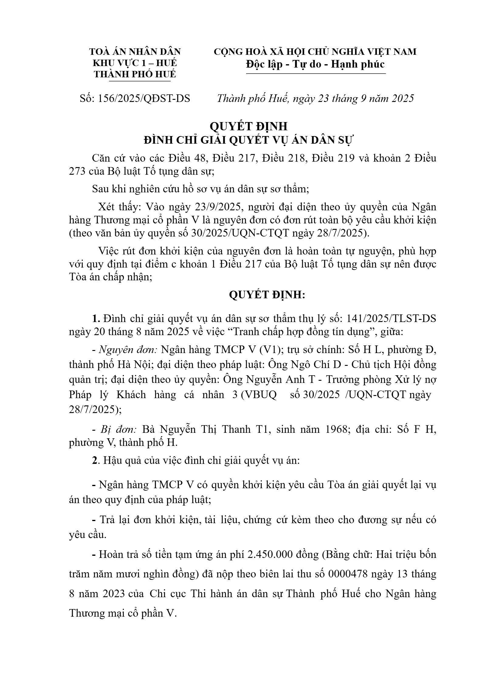 Quyết định số 156/2025/QĐST-DS ngày 23/09/2025 của Tòa án nhân dân khu vực 1 - Huế, TP. Huế về tranh chấp hợp đồng tín dụng