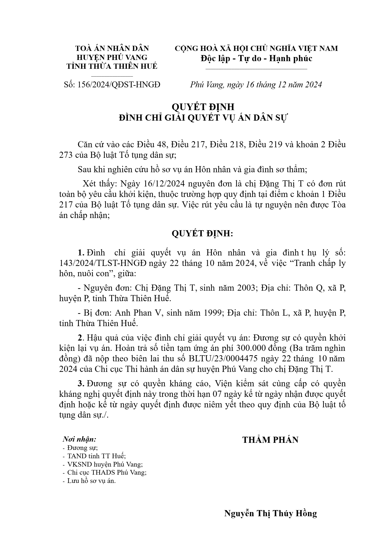 Quyết định số 156/2025/QĐST-HNGĐ ngày 16/12/2025 của Tòa án nhân dân khu vực 1 - Huế, TP. Huế về vụ án ly hôn về mâu thuẫn gia đình