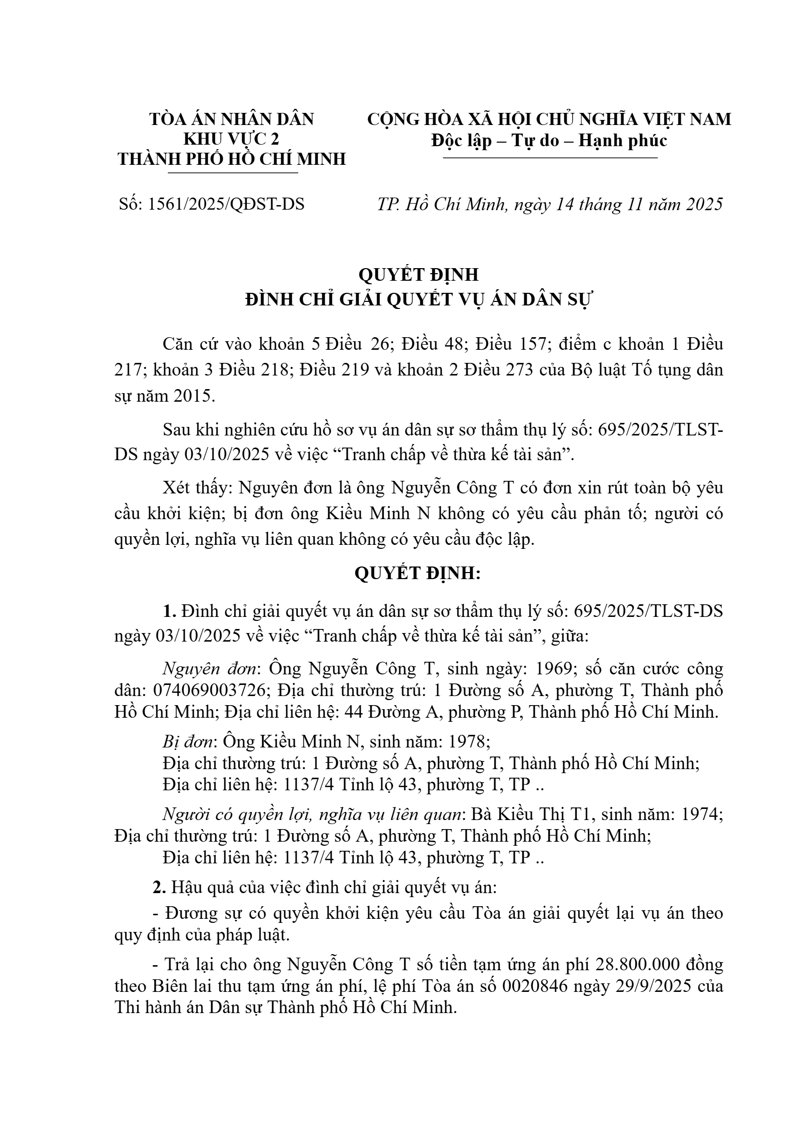 Quyết định số 1561/2025/QĐST-DS ngày 14/11/2025 của Tòa án nhân dân khu vực 2 - Hồ Chí Minh, TP. Hồ Chí Minh về tranh chấp về thừa kế tài sản