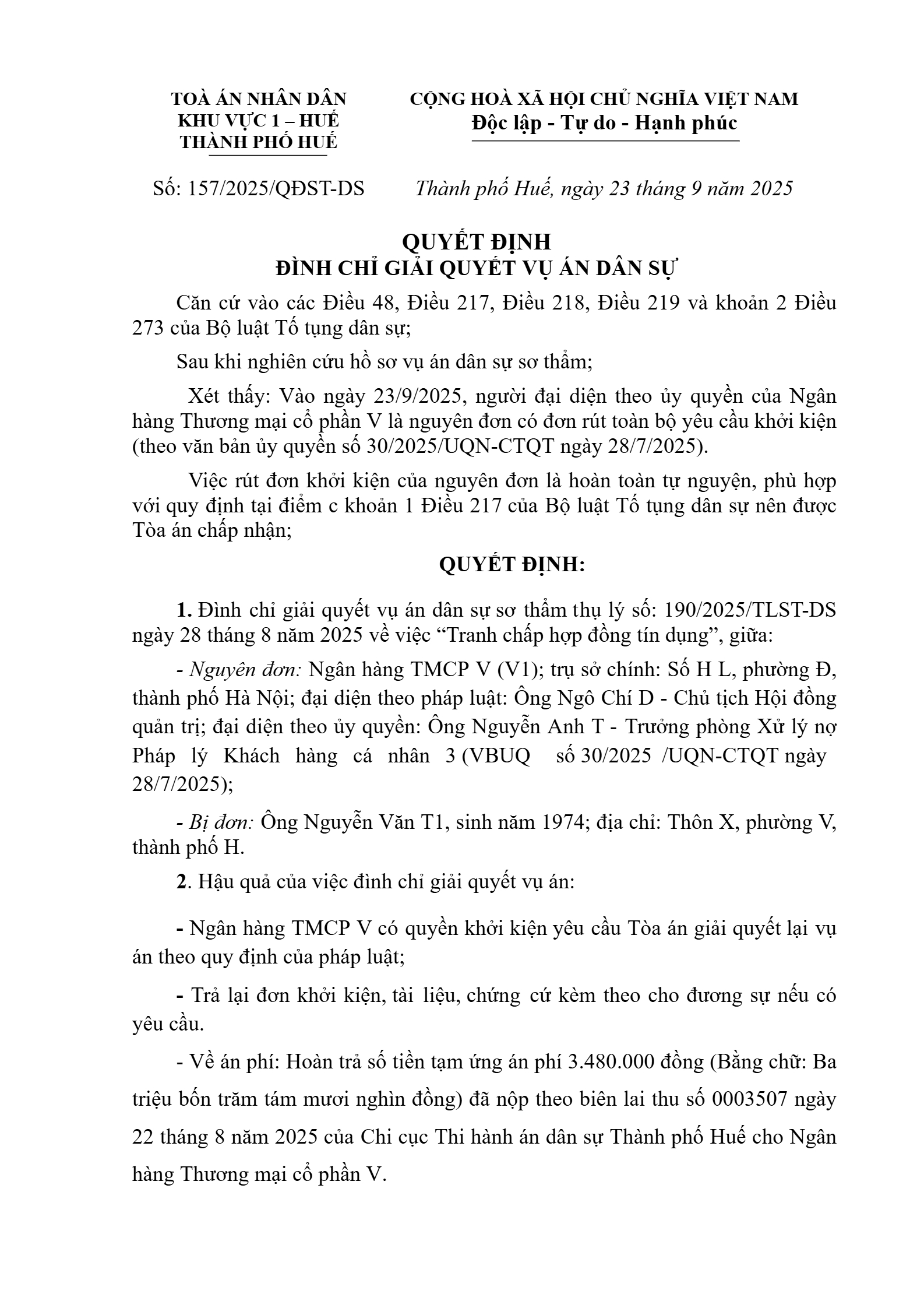 Quyết định số 157/2025/QĐST-DS ngày 23/09/2025 của Tòa án nhân dân khu vực 1 - Huế, TP. Huế về tranh chấp hợp đồng tín dụng