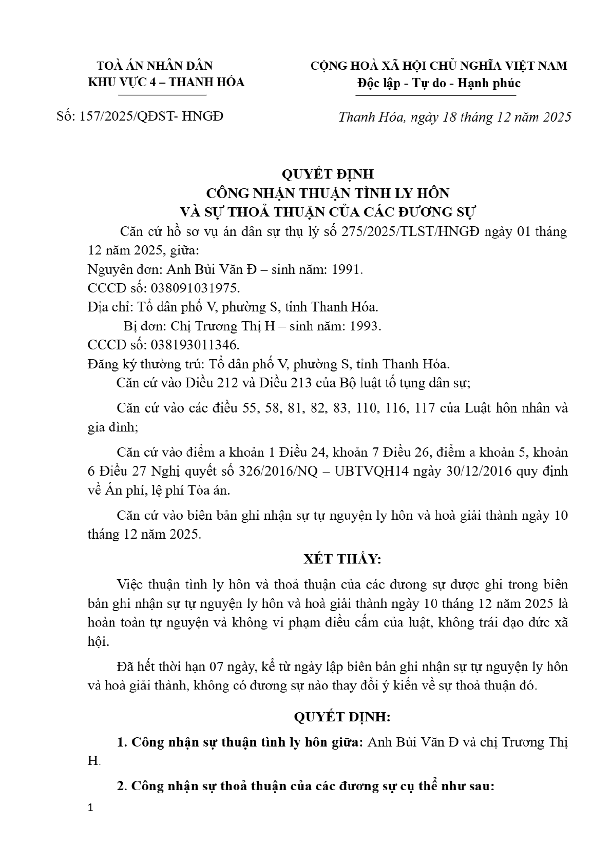 Quyết định số 157/2025/QĐST-HNGĐ ngày 18/12/2025 của Tòa án nhân dân khu vực 4 - Thanh Hóa, tỉnh Thanh Hóa về vụ án ly hôn về mâu thuẫn gia đình