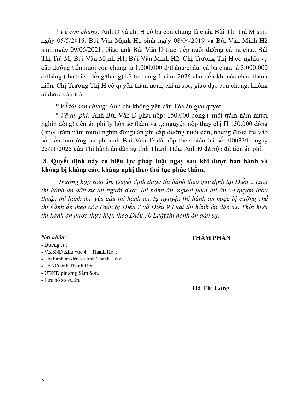 | Thông tin về vụ/việc: | Công nhận TTLH, giao 01 con chung cho mẹ nuôi, bố cấp dưỡng 3 triệu/tháng |