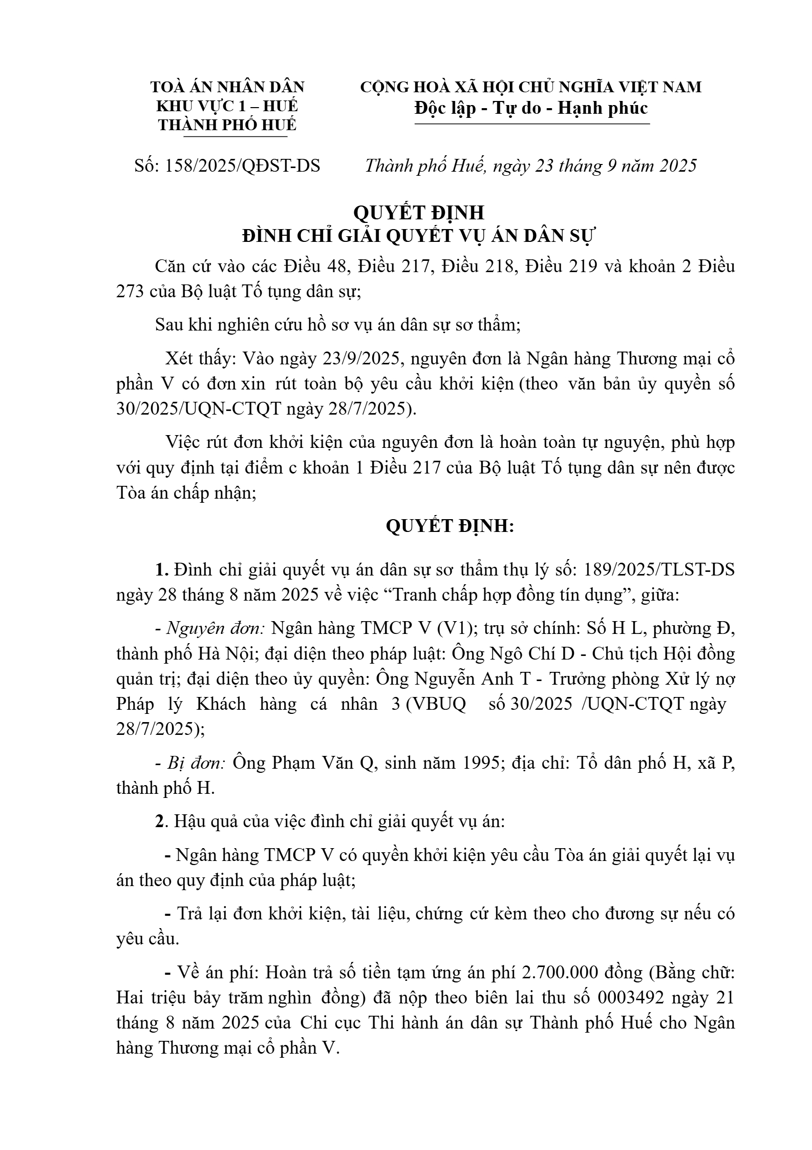 Quyết định số 158/2025/QĐST-DS ngày 23/09/2025 của Tòa án nhân dân khu vực 1 - Huế, TP. Huế về tranh chấp hợp đồng tín dụng