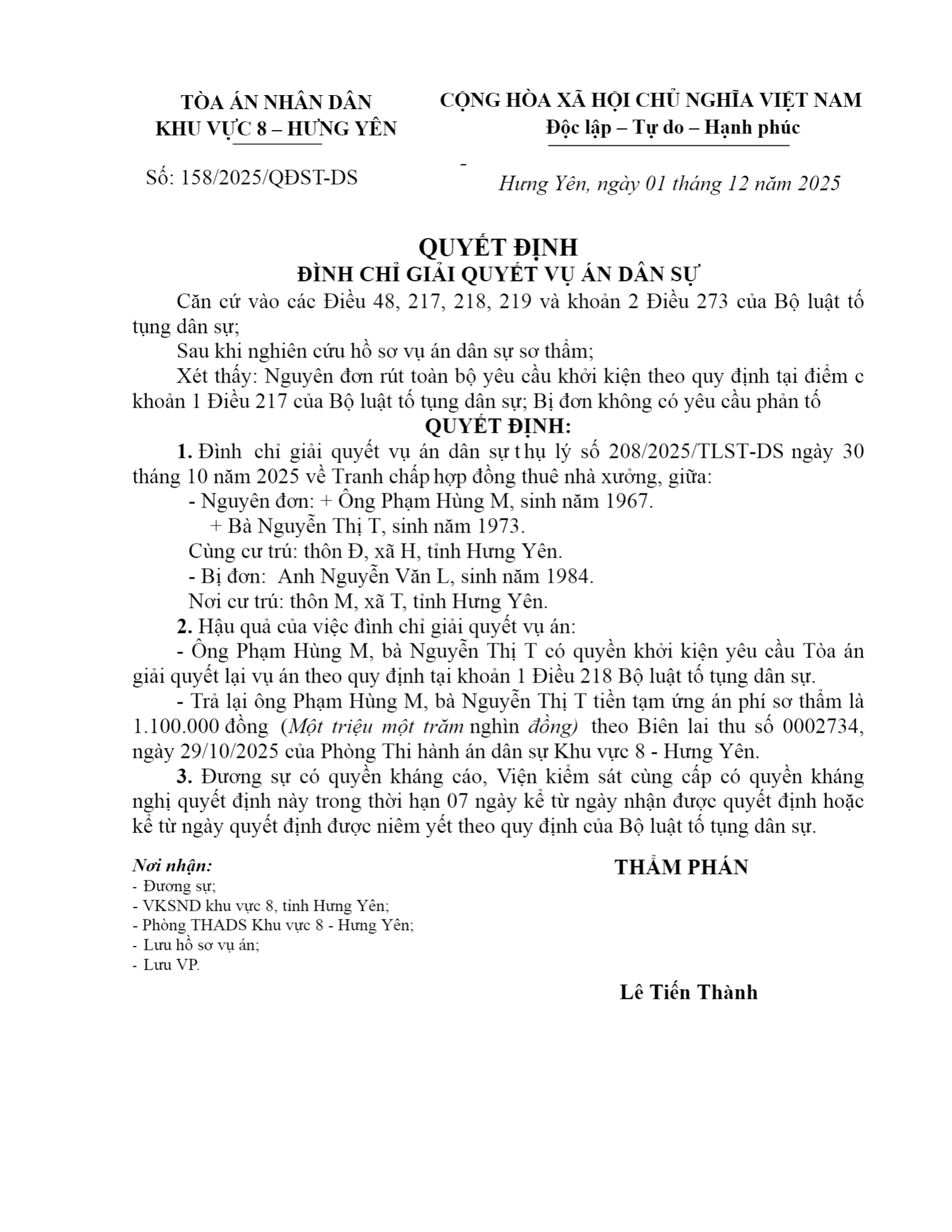 Quyết định số 158/2025/QĐST-DS ngày 01/12/2025 của Tòa án nhân dân khu vực 8 - Hưng Yên, tỉnh Hưng Yên về tranh chấp hợp đồng thuê nhà