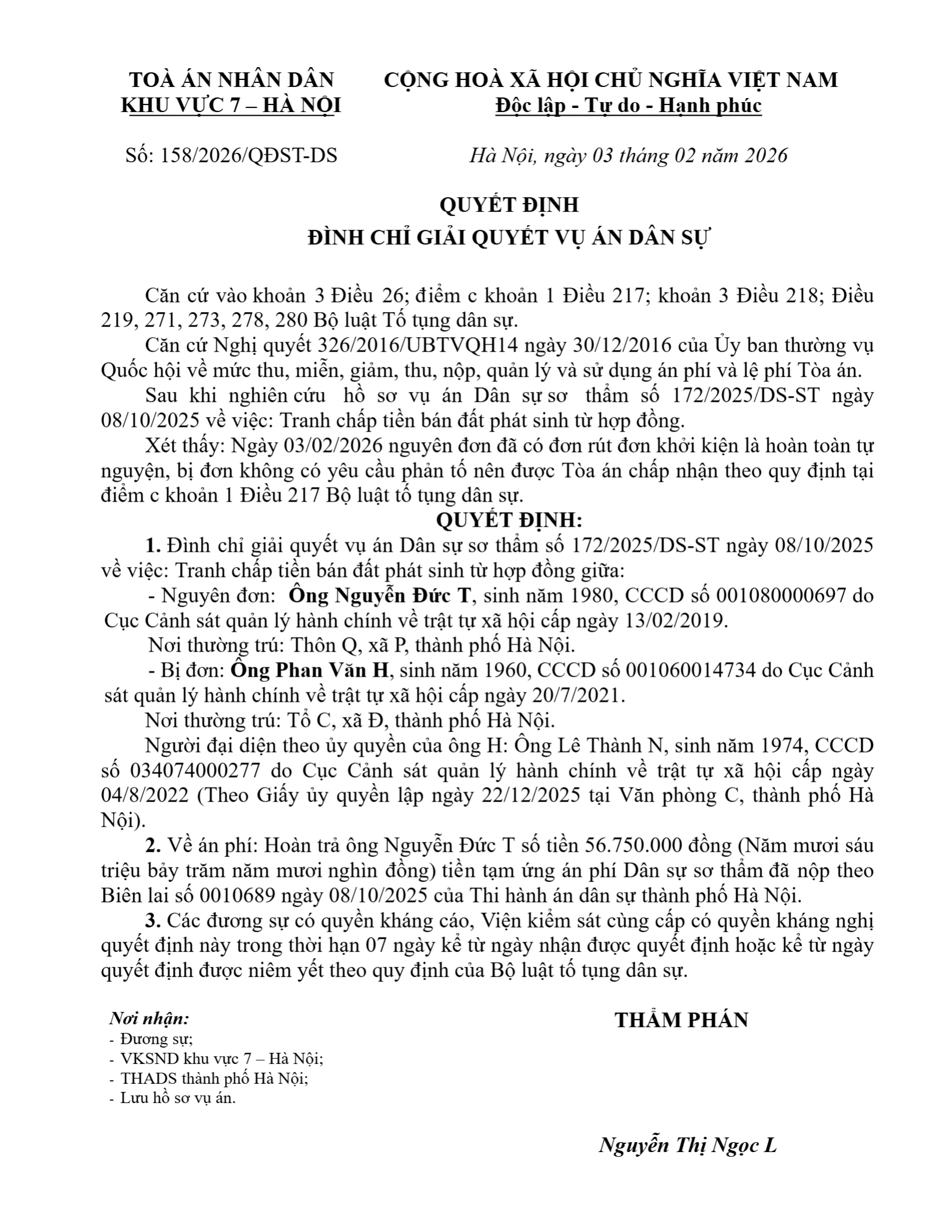 Quyết định số 158/2026/QĐST-DS