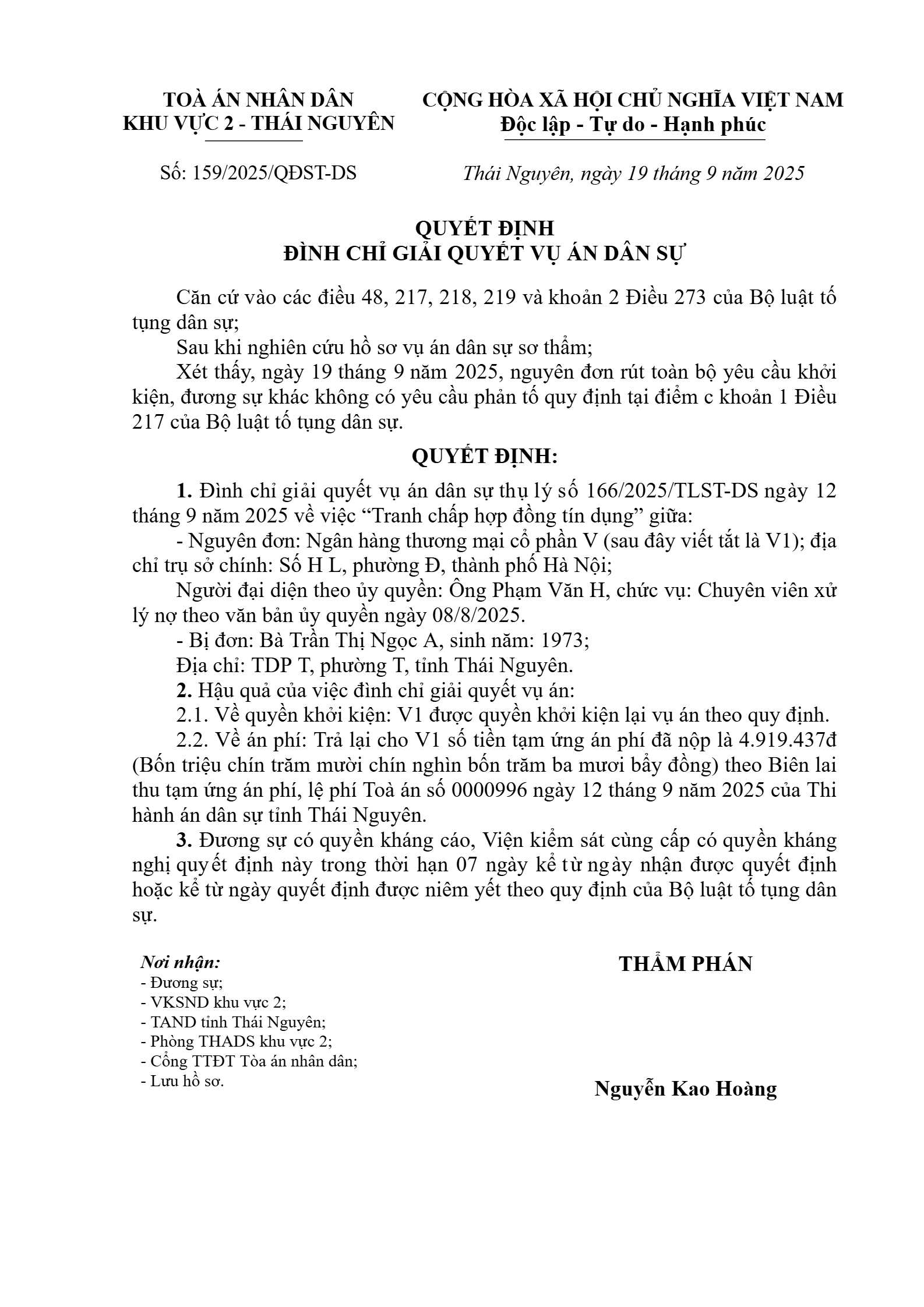 Quyết định số 159/2025/QĐST-DS ngày 19/09/2025 của TAND huyện Đại Từ, tỉnh Thái Nguyên về tranh chấp hợp đồng tín dụng