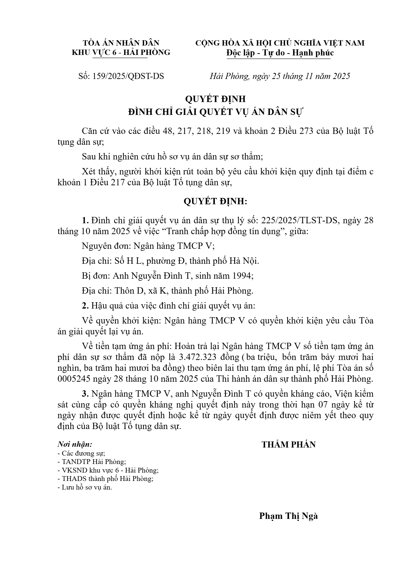 Quyết định số 159/2025/QĐST-DS ngày 25/11/2025 của Tòa án nhân dân khu vực 6 - Hải Phòng, TP. Hải Phòng về tranh chấp hợp đồng tín dụng