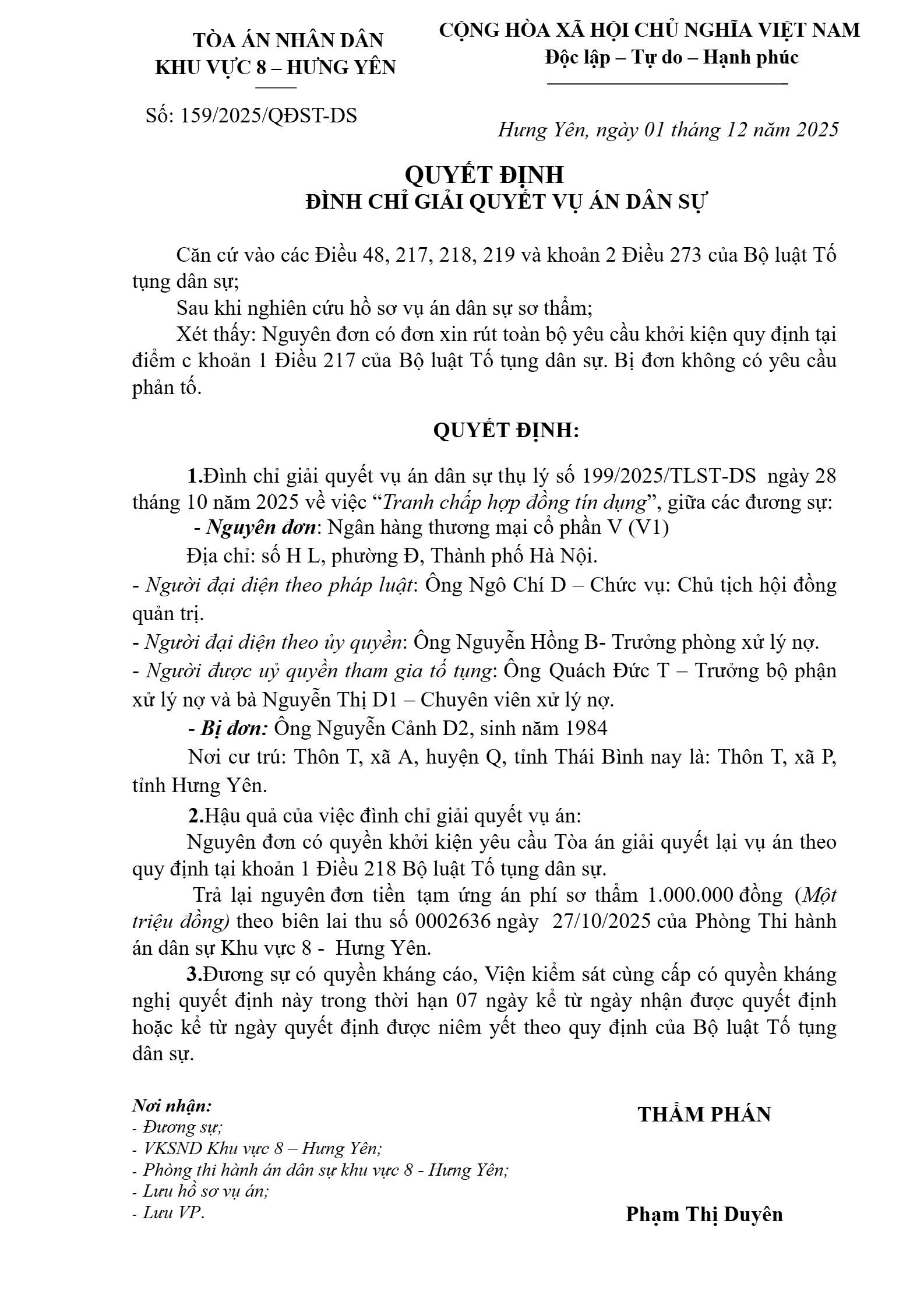 | Thông tin về vụ/việc: | Quyết định đình chỉ giải quyết vụ án dân sự giữa Ngân hàng TMCP V với ông Nguyễn Cảnh D |