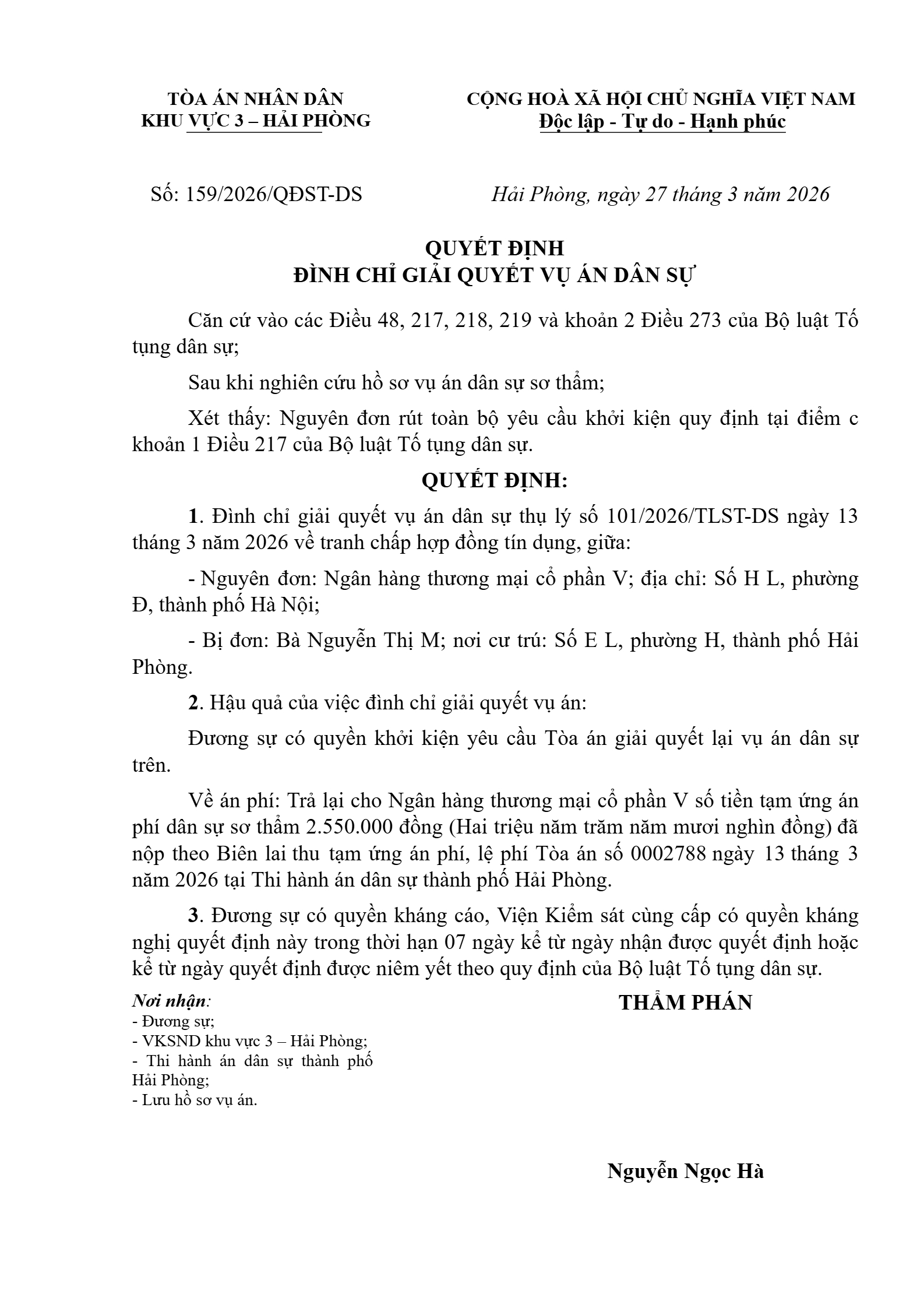 Quyết định số 159/2026/QĐST-DS ngày 27/03/2026 của Tòa án nhân dân khu vực 3 - Hải Phòng, TP. Hải Phòng về tranh chấp hợp đồng tín dụng