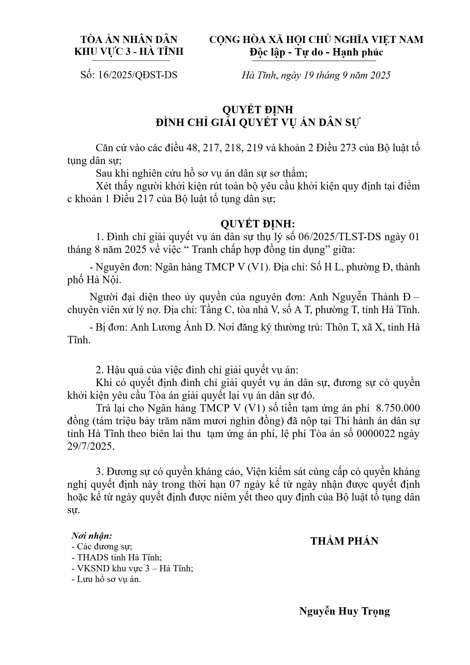 Quyết định số 16/2025/QĐST-DS ngày 19/09/2025 của Tòa án nhân dân khu vực 3 - Hà Tĩnh, tỉnh Hà Tĩnh về tranh chấp hợp đồng tín dụng