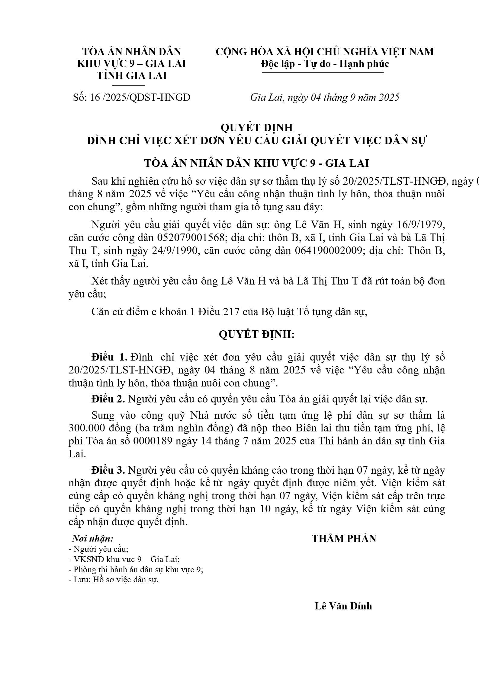 Quyết định số 16/2025/QĐST-HNGĐ ngày 04/09/2025 của Tòa án nhân dân khu vực 9 - Gia Lai, tỉnh Gia Lai về yêu cầu công nhận thuận tình ly hôn