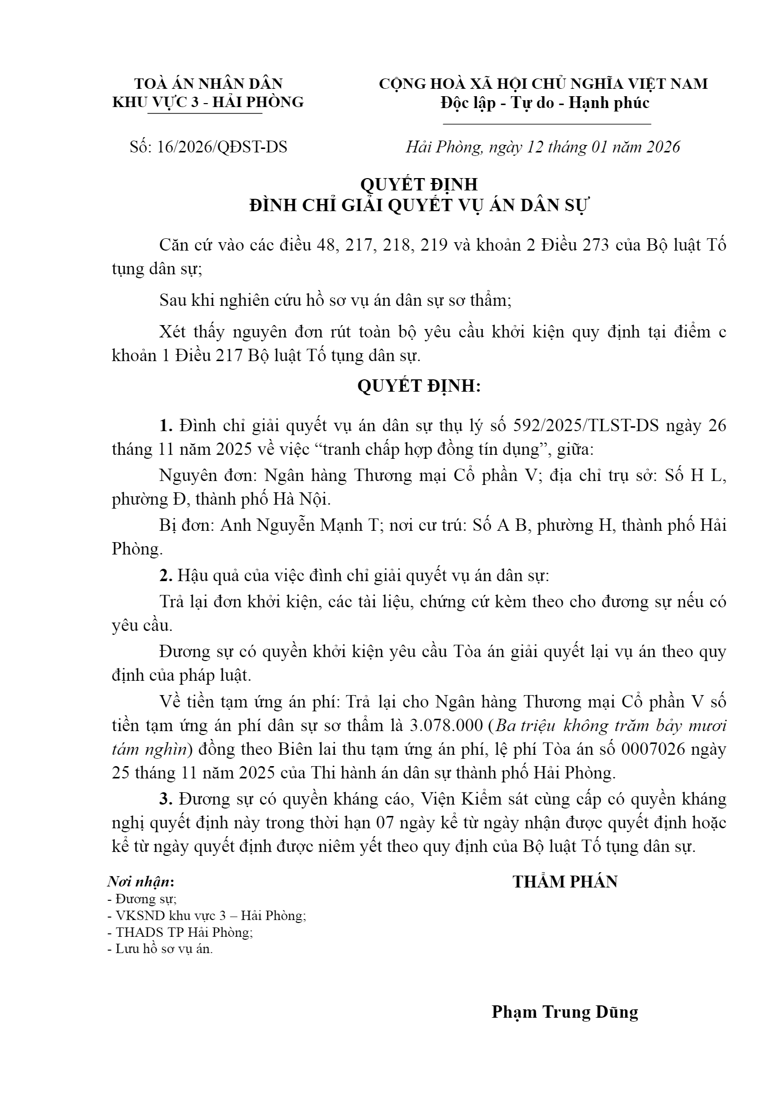 Quyết định số 16/2026/QĐST-DS ngày 12/01/2026 của Tòa án nhân dân khu vực 3 - Hải Phòng, TP. Hải Phòng về tranh chấp hợp đồng tín dụng