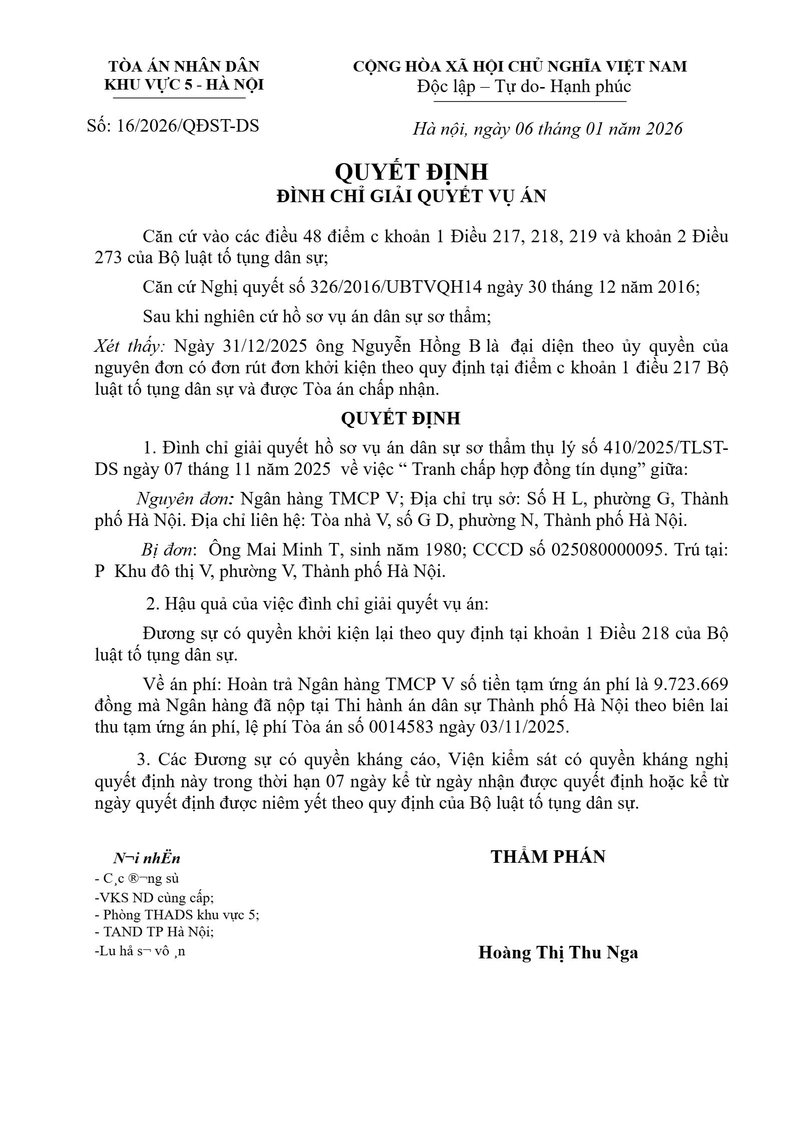 Quyết định số 16/2026/QĐST-DS ngày 06/01/2026 của Tòa án nhân dân khu vực 5 - Hà Nội, TP. Hà Nội về tranh chấp hợp đồng tín dụng